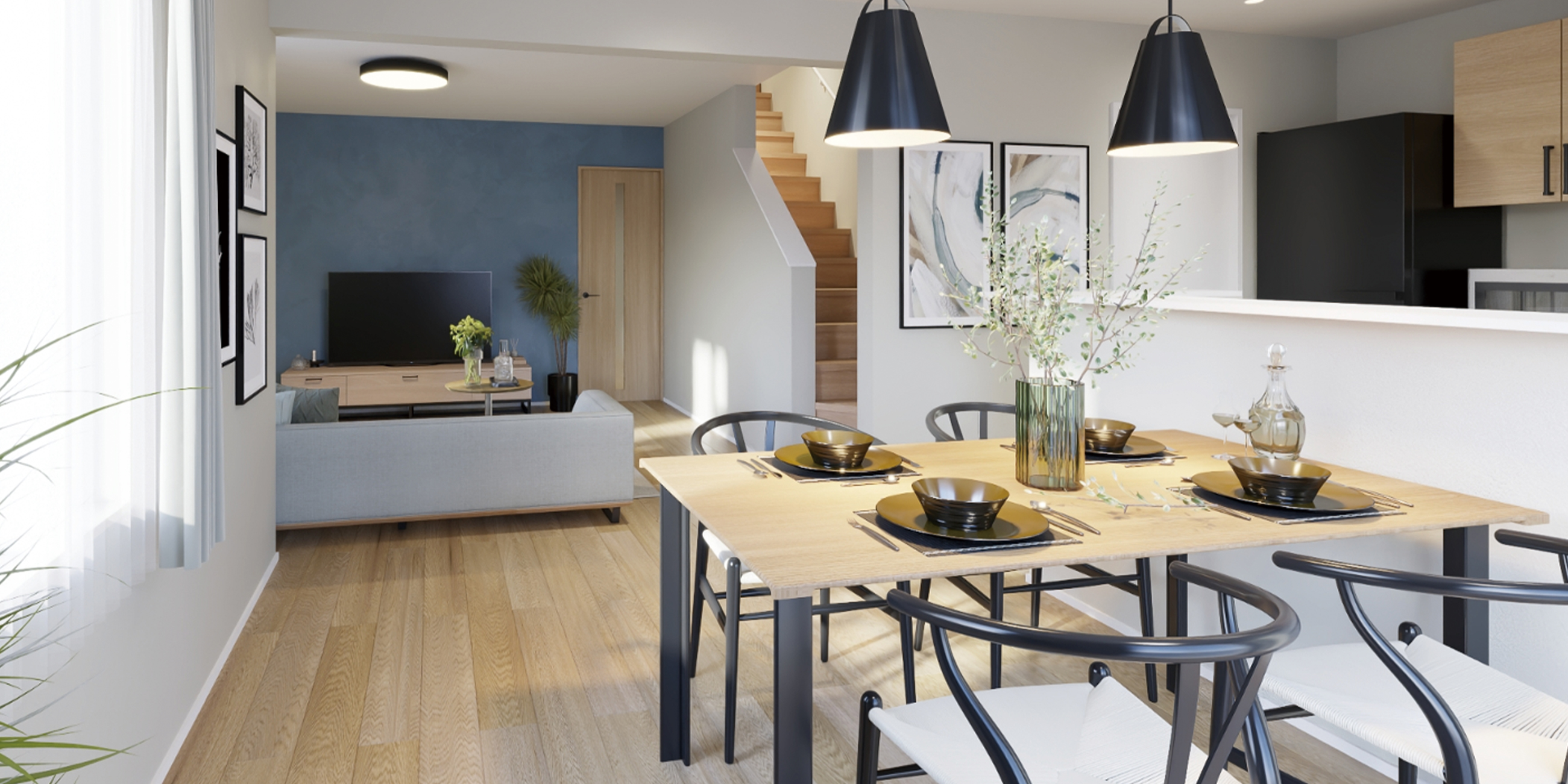 家族の気配を感じられ、暮らしに溶け込むリビング階段。開放感あふれる設計で、安心感とつながりを生み出します。