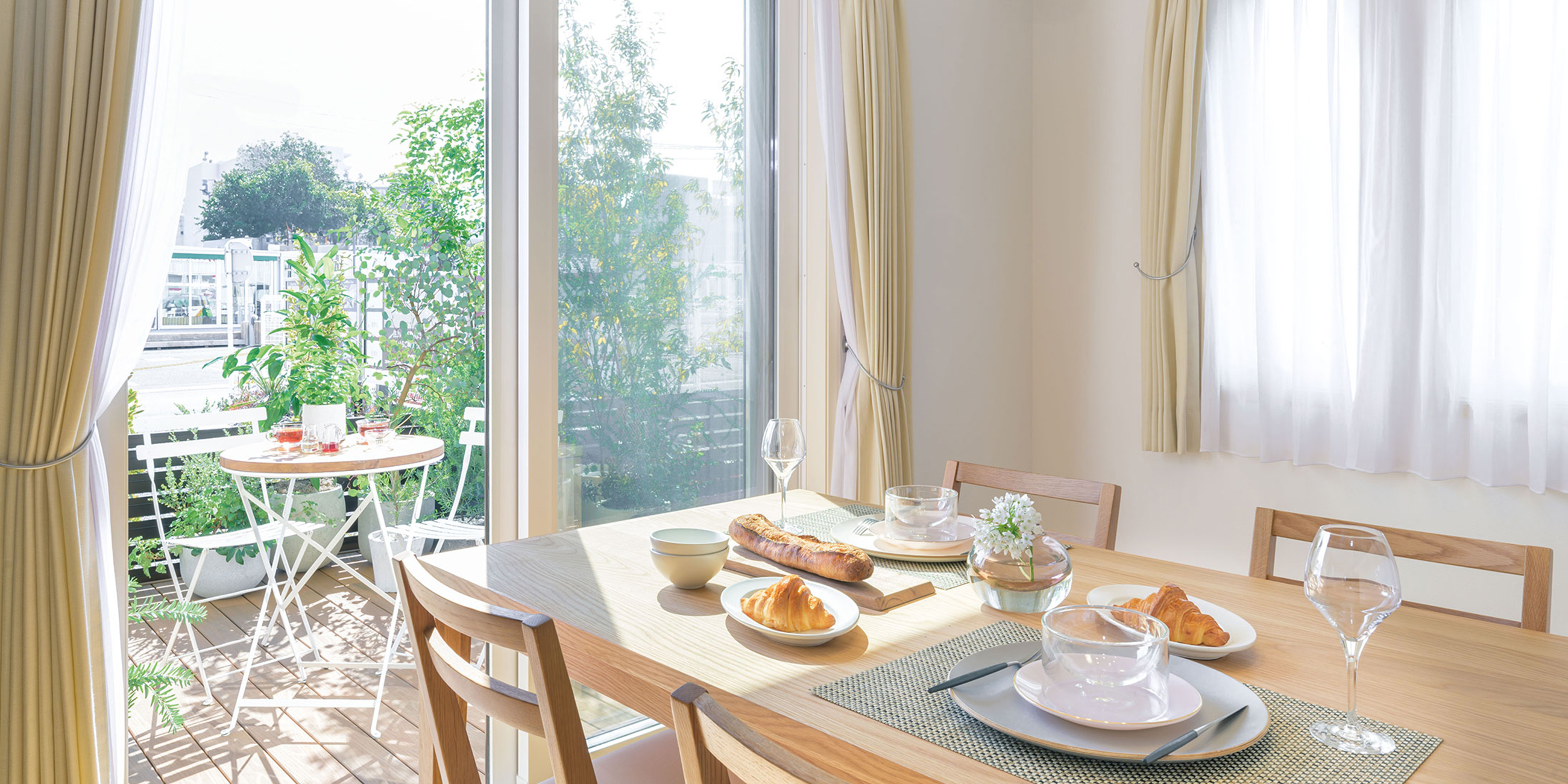 南向きの窓が2面に広がるLDKは、日中は照明いらずの明るさ。テラスとつながる設計で、室内と外がゆるやかにつながり、家族が自然と集まる心地よさを生み出します。