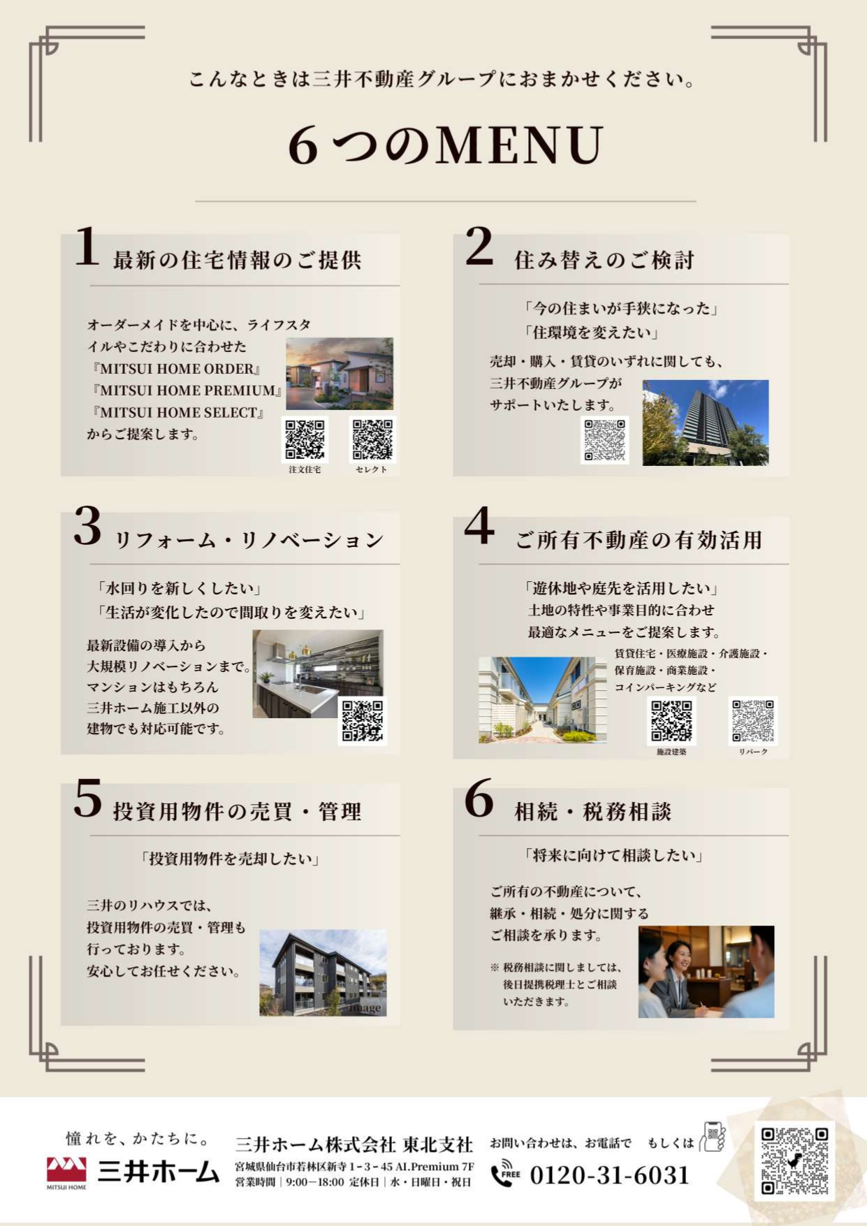 不動産売却、住み替え、新築、リフォーム、その他不動産活用について、ご相談いただけます。