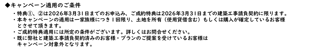 ※ 特典①、②は2026年3月31日までのお申込み、ご成約特典は2026年3月31日までの建築工事請負契約に限ります。