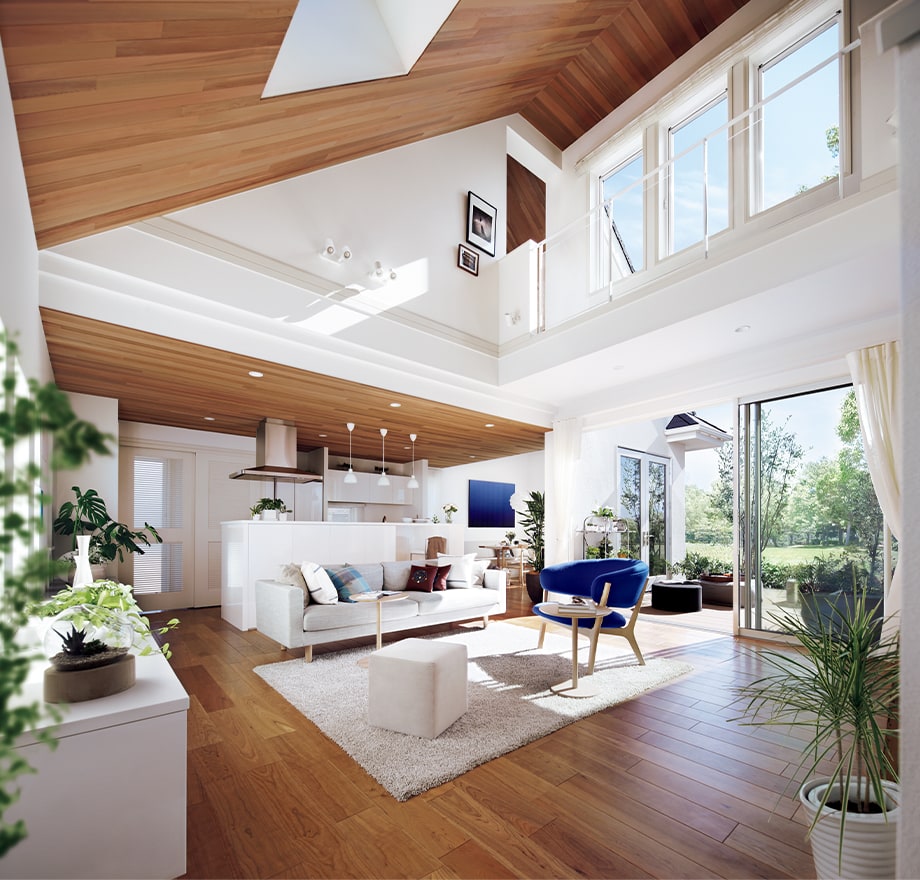 オリジナル技術の「DSP」「BSW」「マットスラブ」で枠組壁工法を基本性能・安全性を強化。これによって開放的な吹き抜けや大開口を実現することが可能になりました。