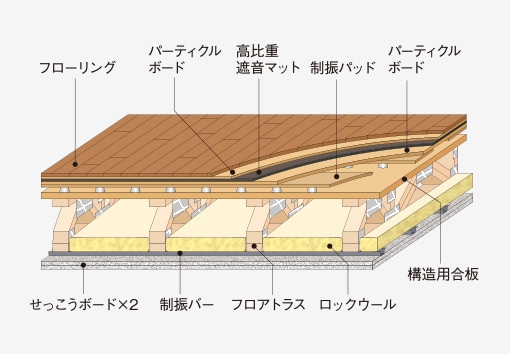 現在は、さらに性能の高いMute45・50を取り入れています。これは一般的な鉄骨住宅の床遮音仕様と比べ、約3分の1に軽減する床遮音性能を実現しています。制振パッドによって歩行音を大幅に吸収し、賃貸住宅の入居者の上下階の騒音ストレスを大幅に軽減します。