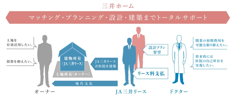 地域に根ざした医療を目指し開業を希望する医師の中で、開業資金の初期投資を低額に抑え、一戸建てのクリニックを建築できるリース診療所です。