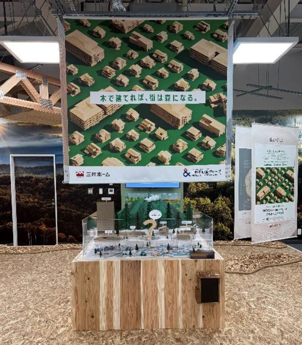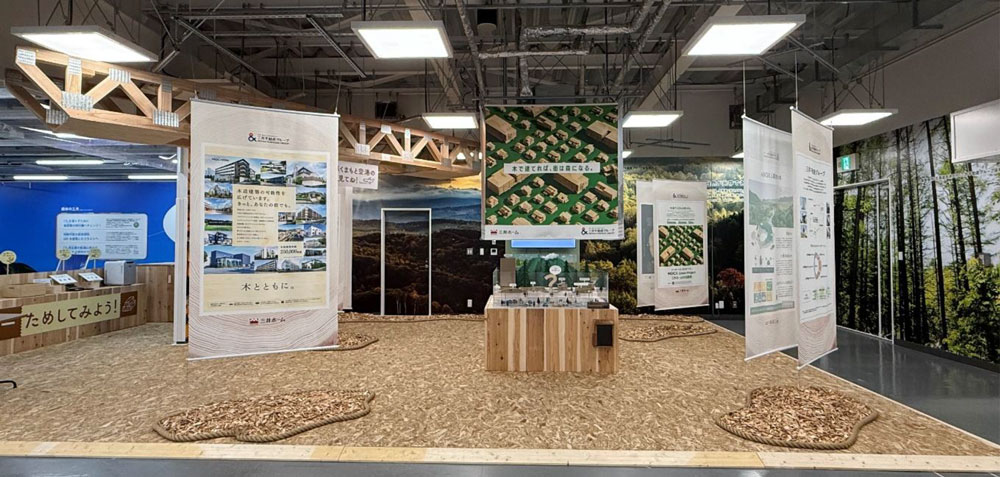 三井不動産グループは、2025年4月に街づくりにおける環境との共生宣言「&EARTH for Nature」を策定し、「環境」を自然、人、地域が一体となったものと捉え、持続可能であり魅力が増す街づくりを推進しています。三井ホームは、阿蘇くまもと空港の「天井」をはじめとする様々な木造建築を手掛けるなど、三井不動産グループの一員として、長年にわたり「木」の可能性を追及し、木の環境価値の一つである「炭素を固定する力」を活かし、様々な建物の木造化を推進し、環境負荷の低減に貢献してまいりました。この度、より多くの人々に「木の魅力」を伝えるべく、三井不動産と共同で、「木で建てると街は森になる」をテーマにした木造建築の技術や、木の循環を活かした環境への取り組みなど、体験型の展示を「くまもとSDGsミライパーク」の企業展示エリアへ出展いたしました。