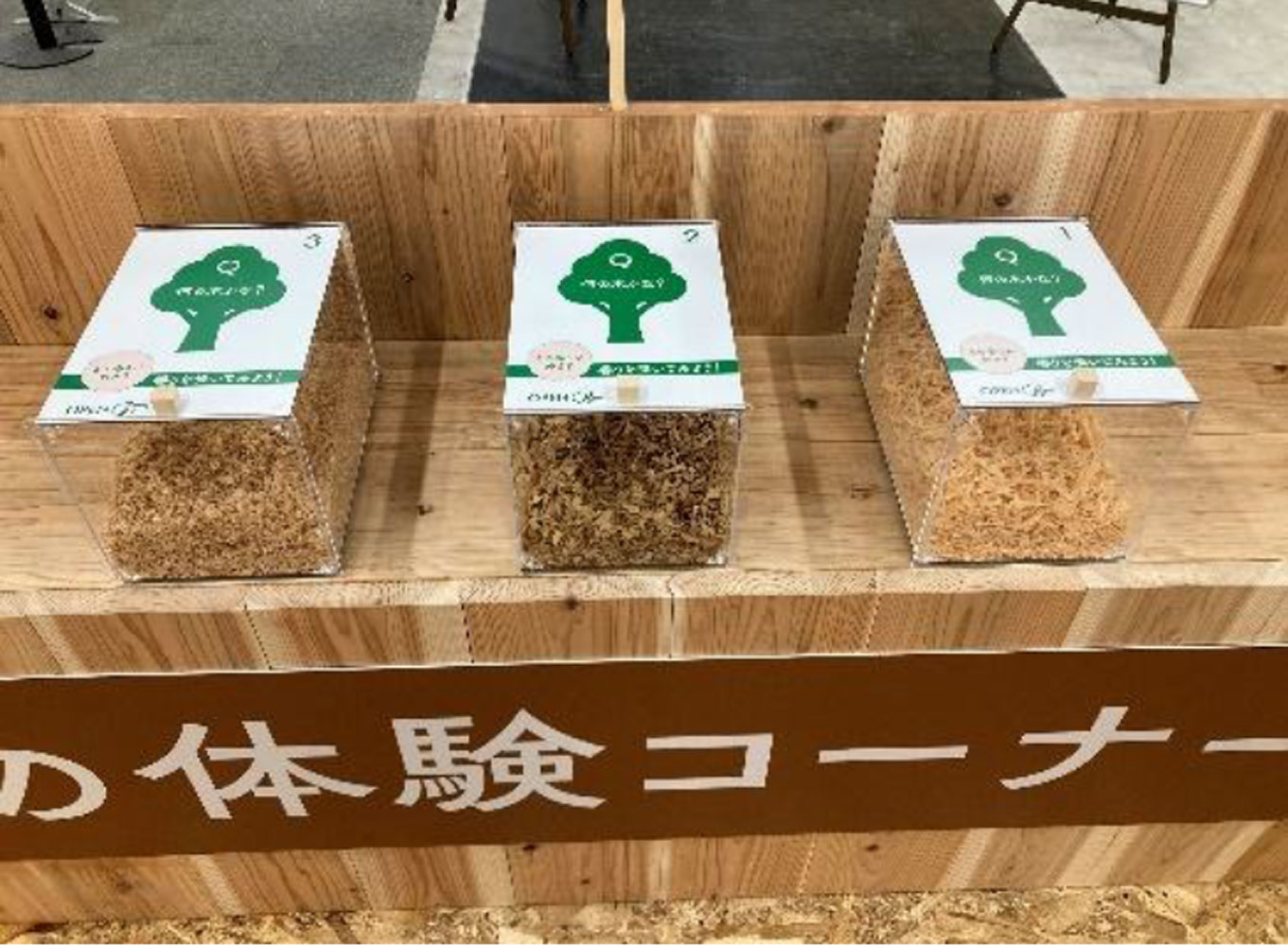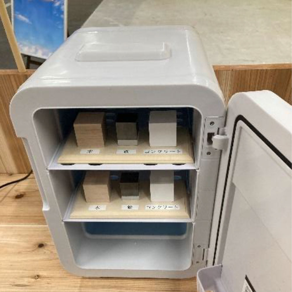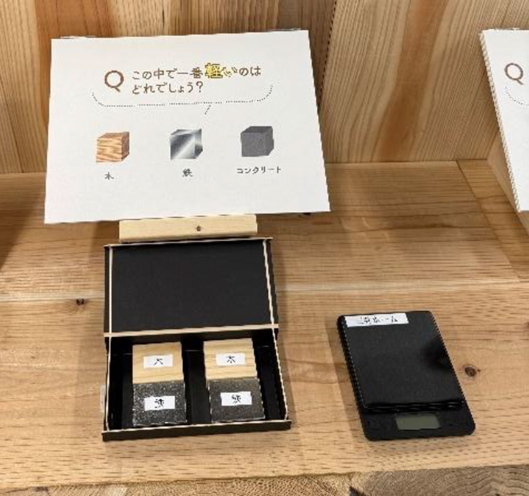 ・“木の空間は体に良い“を体感:木の体感コーナーを設置。冷蔵庫で冷やした木・鉄・コンクリートをさわり素材による温度の違いを体感、すぎ、くすのき、ひのきの香りの違いを体感、同じ大きさの木・鉄・コンクリートを持ちあげ重さの違いを体感などができます。