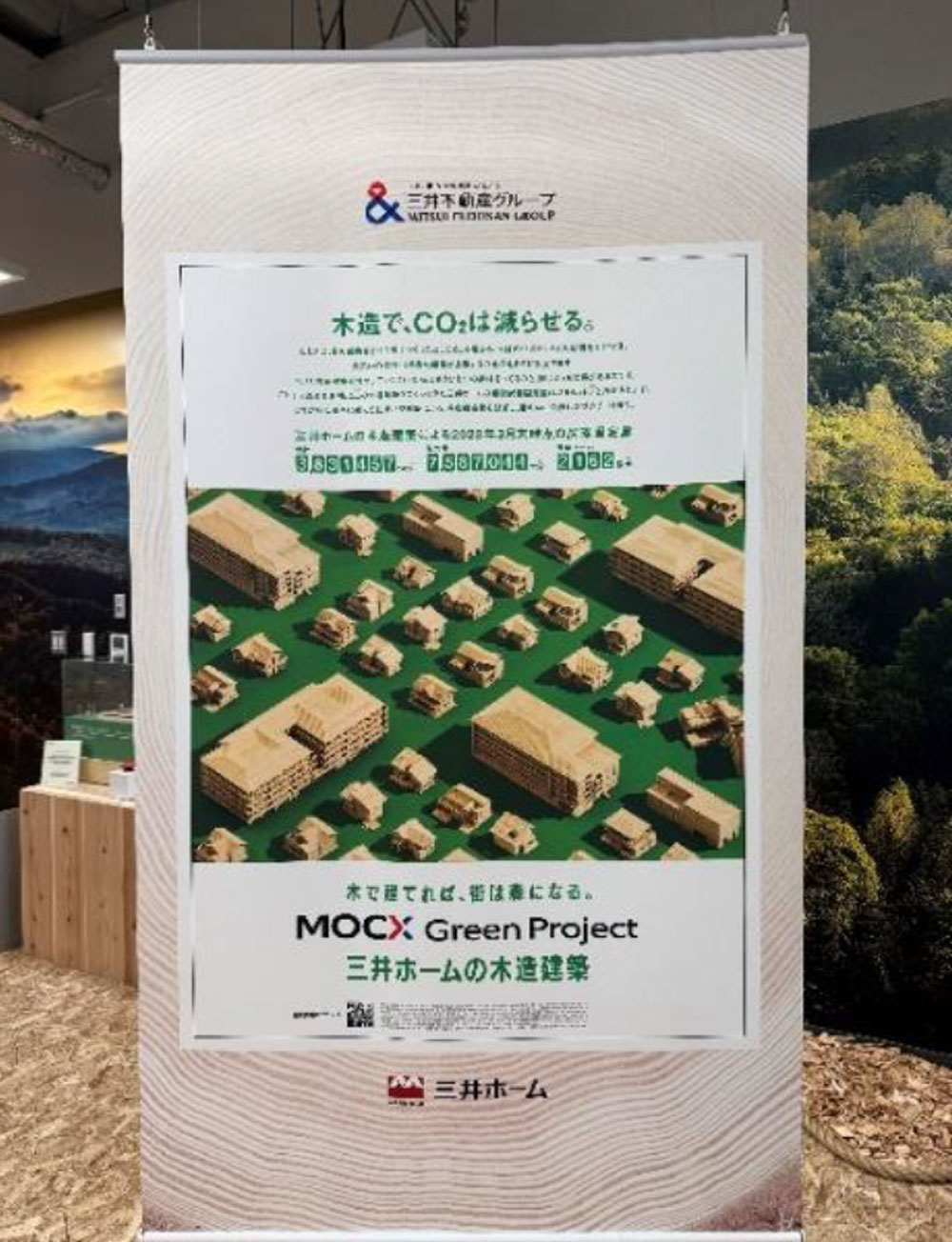 - 『木で建てれば街は森になる』をテーマに、阿蘇くまもと空港の天井を手掛けた三井ホームの技術力や高層木造建築への取り組み、三井不動産の保有林など、三井不動産グループの木に関する様々な取り組みを体験型の展示で紹介