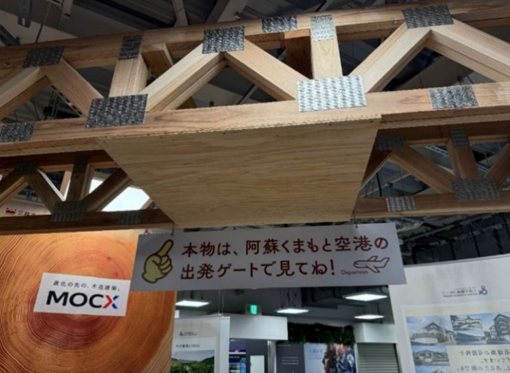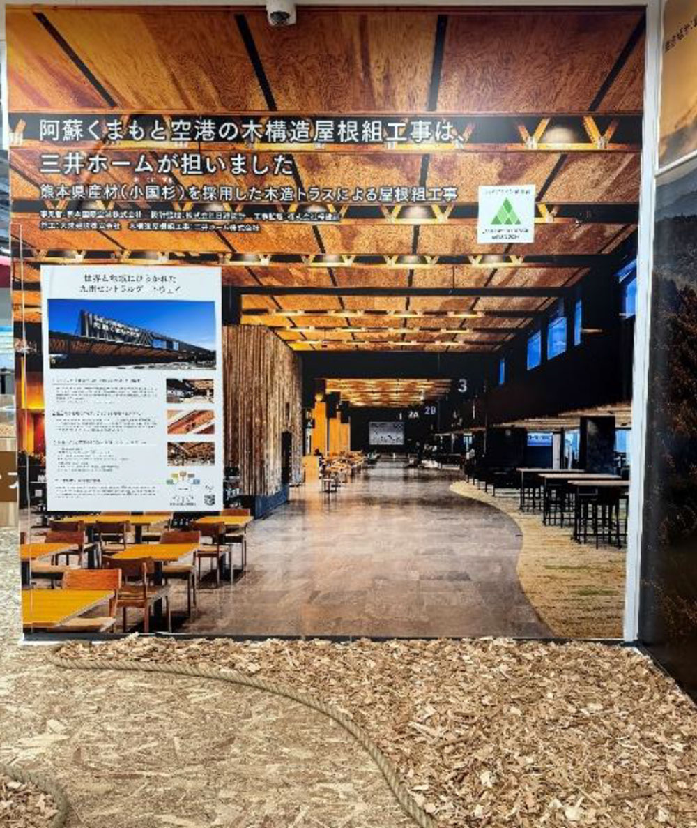 ・木造建築の技術力と魅力:阿蘇くまもと空港の天井を手掛けた技術力や高層木造建築への取り組みについて模型も展示して紹介しております。