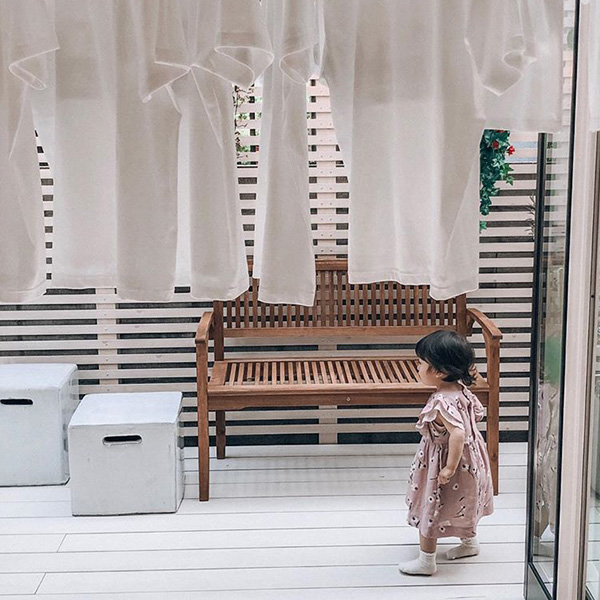 横だけじゃなく上にも適度な囲いがあって、プライベート感が確保できているから、人の目が気にならないのがいいですね。普通のバルコニーは上部が全部開けているのが気になっていました。掃除などの管理も簡単そうだし、部屋との行き来がラクなのがいいです。