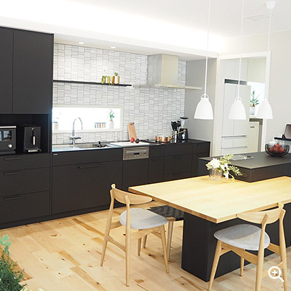 黒の家電って、今すごく流行っていますよね。SNSでもよく見かけます。おしゃれでスタイリッシュで、やる気が出そう! うちは子どもがいつも作業台に乗りたがるんです。気になるみたいで…。でもこの家だとすぐ隣にリビングがあるし、これだけ広ければひとりでも遊んでてくれそうです。キッチンのすぐ後ろがダイニングテーブルなのもいいですね。料理を作ってそのまま出せる!