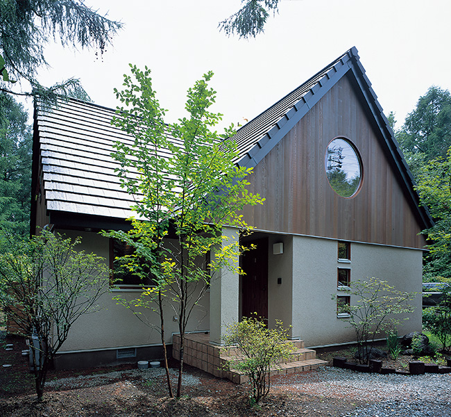 国内有数の避暑地として知られるリゾートエリア。F様の別荘は、小川のせせらぎが聞こえる静かな森の中にあります。童画家だった奥様のお父様の作品を展示したミニギャラリーを開くことがご夫婦の夢でもあり、この広い敷地を得てギャラリーを取り込んだリゾートハウスの建築を実現されました。「美術館めぐりの際に気軽に立ち寄ってもらいたいので、山小屋風の別荘という感じではなく、絵を飾っても合うような柔らかな空間にしたかった」と語られる奥様。