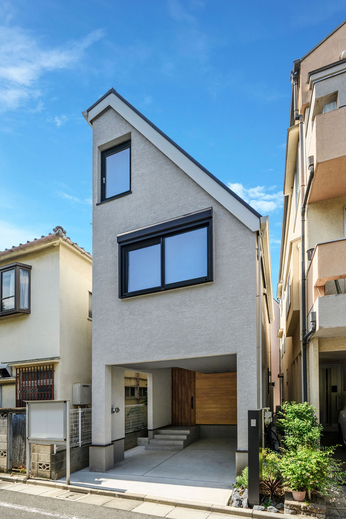 斜線制限に合わせた屋根勾配を生かしてシャープな印象の外観に。