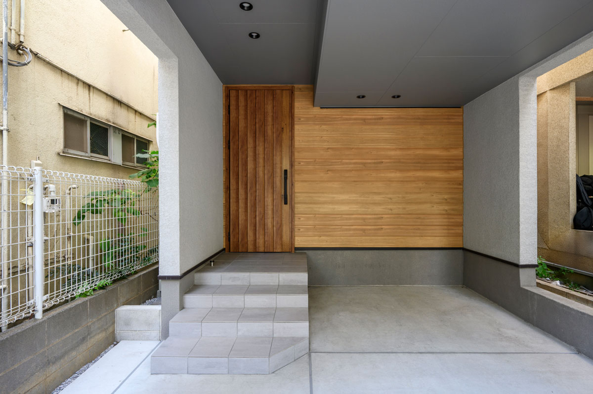 玄関回りにはラップサイディングを用い、玄関ドアとともに木の温もりを加えています。