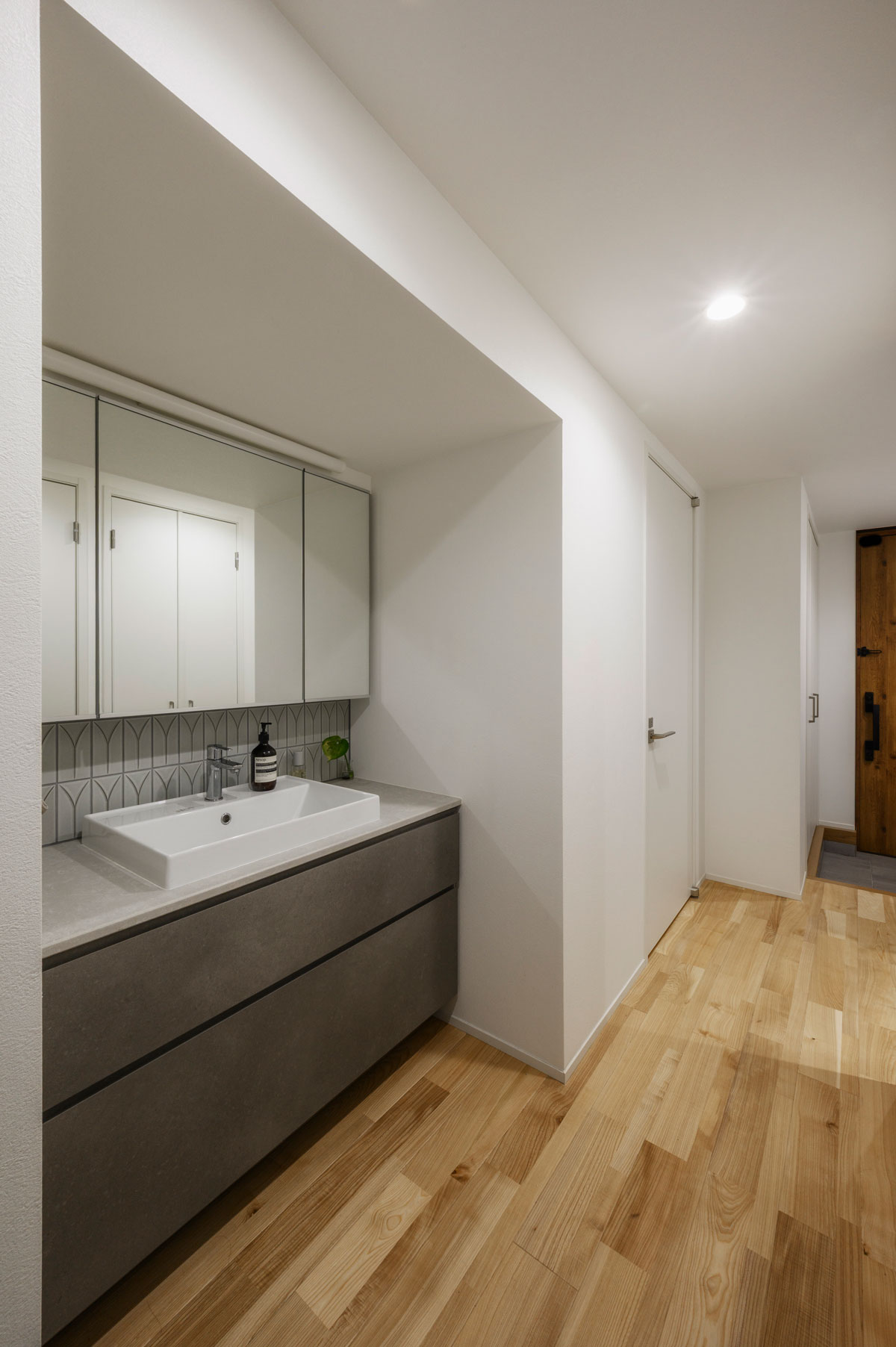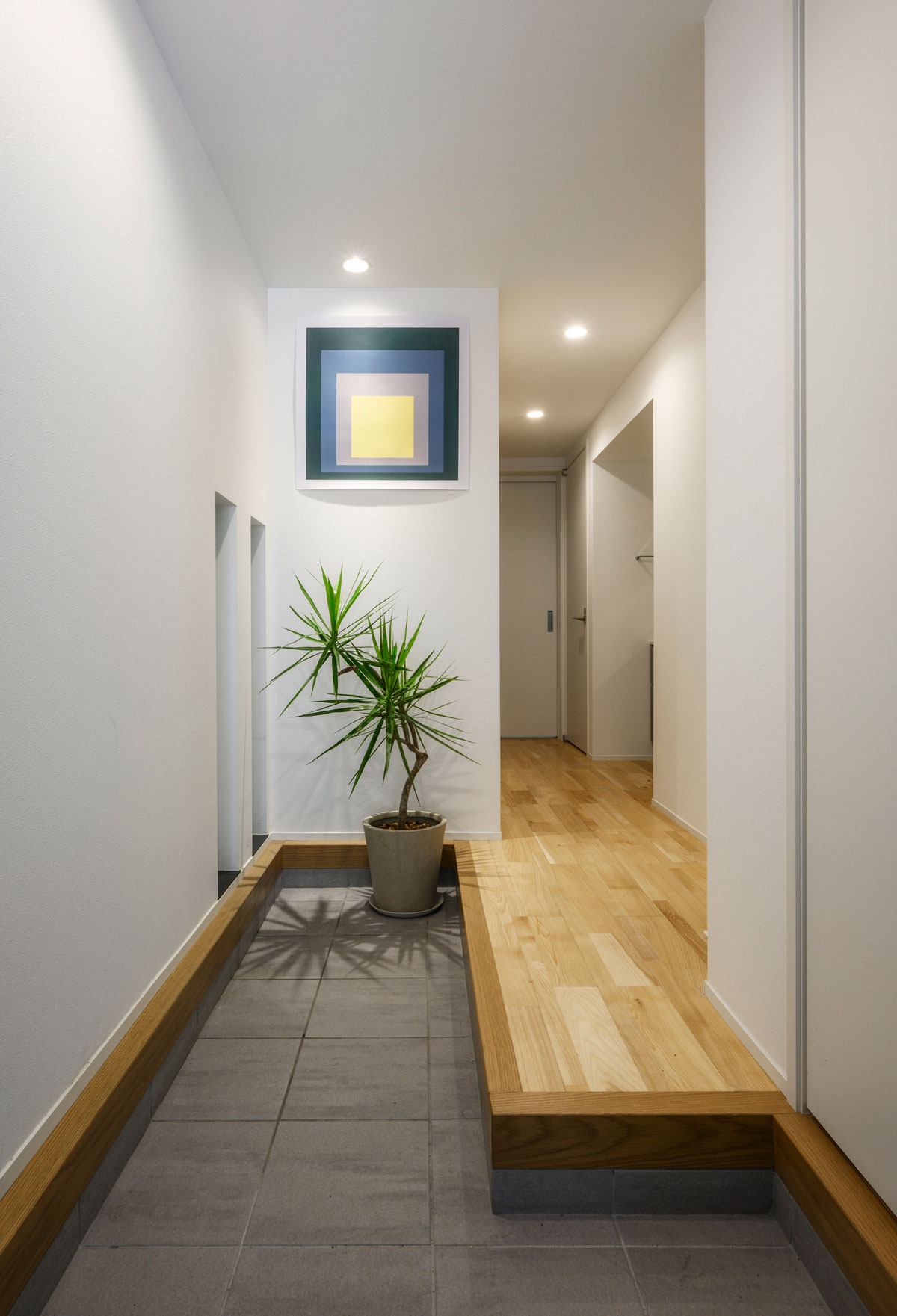 玄関は土間をL字型に設け、ホールとともに視線を奥へ誘導。