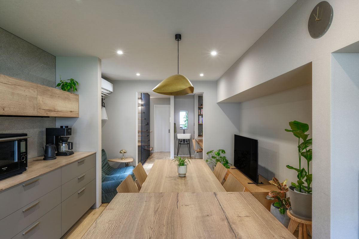 キッチンから見ると、西側の階段ホールまで視線がのびて広々と。