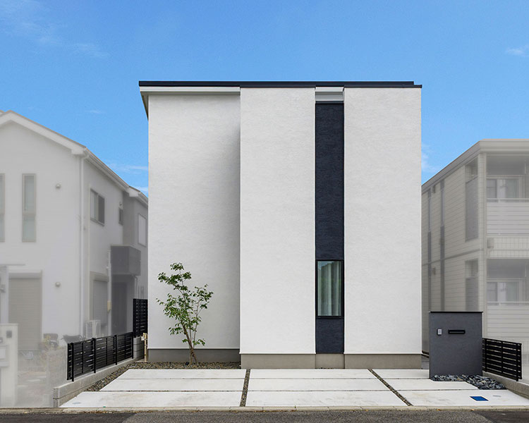 外壁に2色の吹き付けと2種類のタイルを用いた外観。色のトーンを変えることによって、統一感とアクセントをバランスよく整えて表情豊かなデザインに。