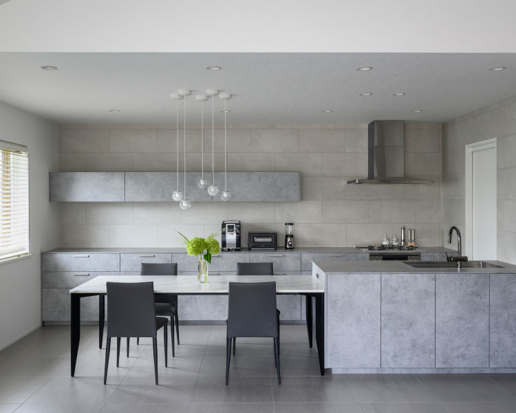 オープンなキッチンは、クロス、キャビネットともにグレー系で統一し、落ち着いたイメージに仕上げた。照明はスポットライトにより、シーンに応じて明るさを変えている。