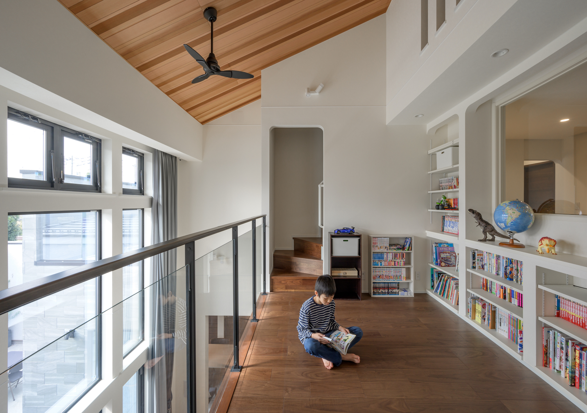 吹き抜けと階段の間にブリッジ状に設けた2階ホールは、吹き抜け側の透明感のある手摺りと階段側の内窓で浮遊感のある空間に。家族共有のライブラリーになっている。