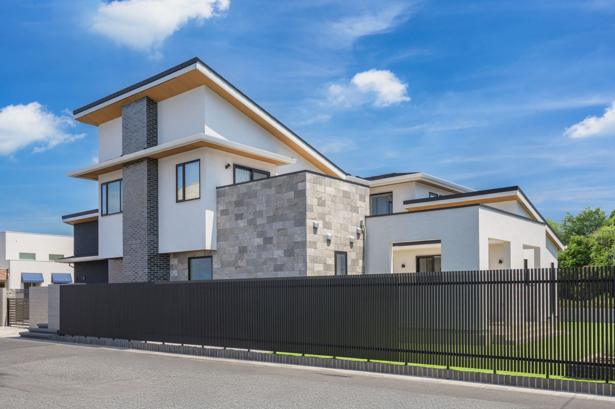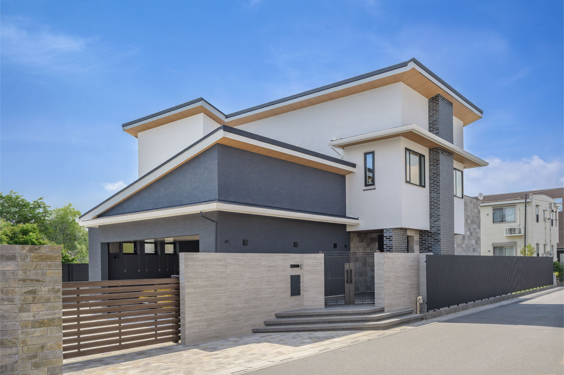 まるで二つの建物が連なって見える個性豊かな外観。ガレージ部分はチャコールグレー、家屋部分はスノーホワイトと、外壁の吹き付け仕上げの色を分けることで、めりはりをつけた。