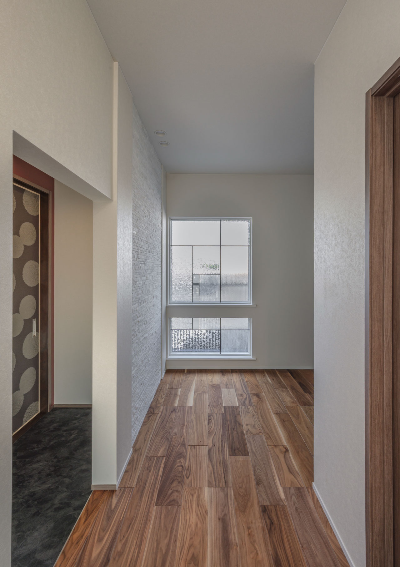 廊下側から玄関ホールを見ると、正面の飾りガラスの窓から美しい自然光が差し込んでいる。左手に見えるのは和室への入り口。石目柄のフロアタイルを貼って視覚的にゾーニングしている。