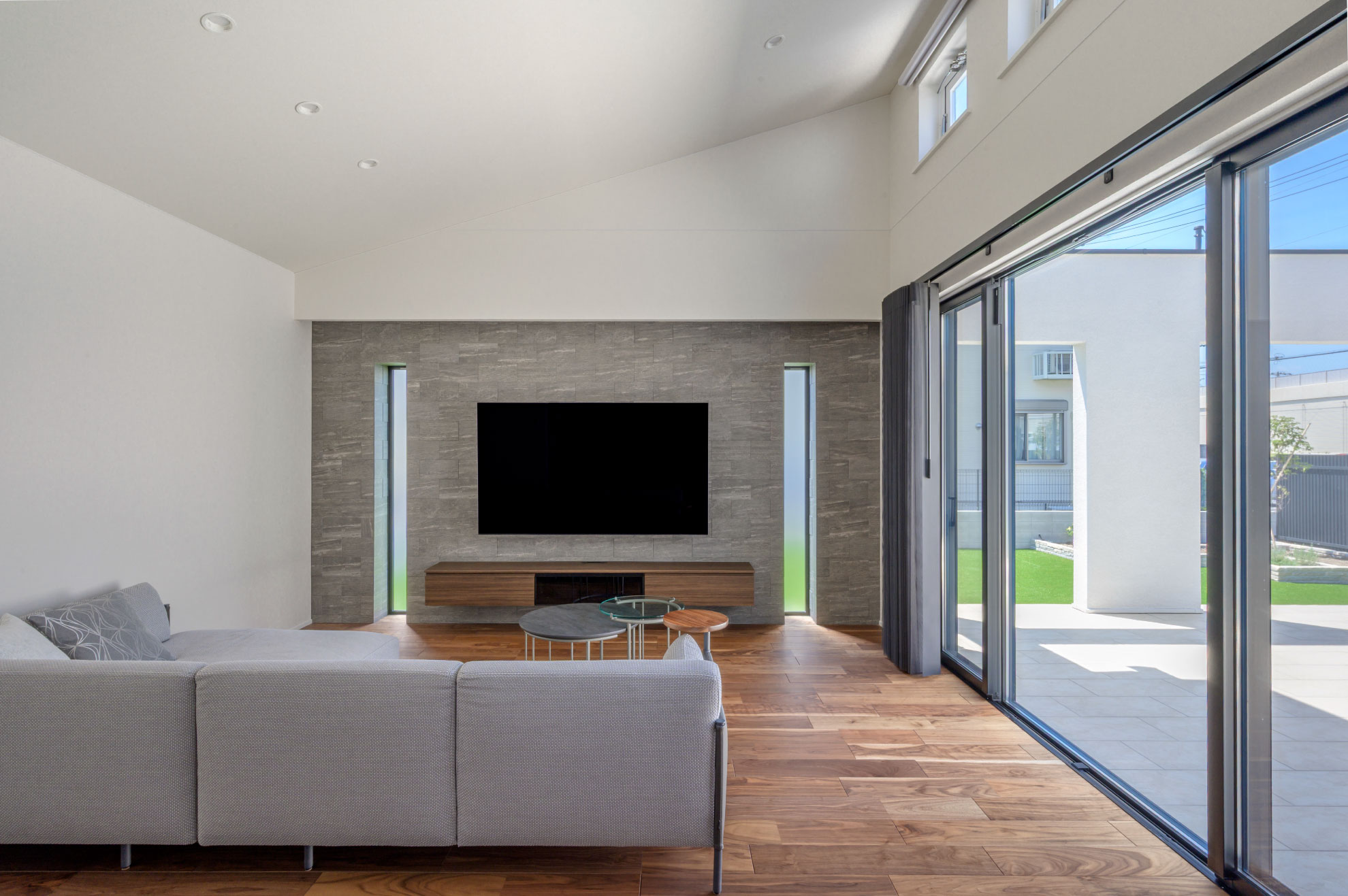 インテリアのベースは、質感あふれるブラックウォルナットのフローリング。テレビの背後の壁にはアッシュブラウンのタイルを選び、シンプルながらシックな空間にまとめた。