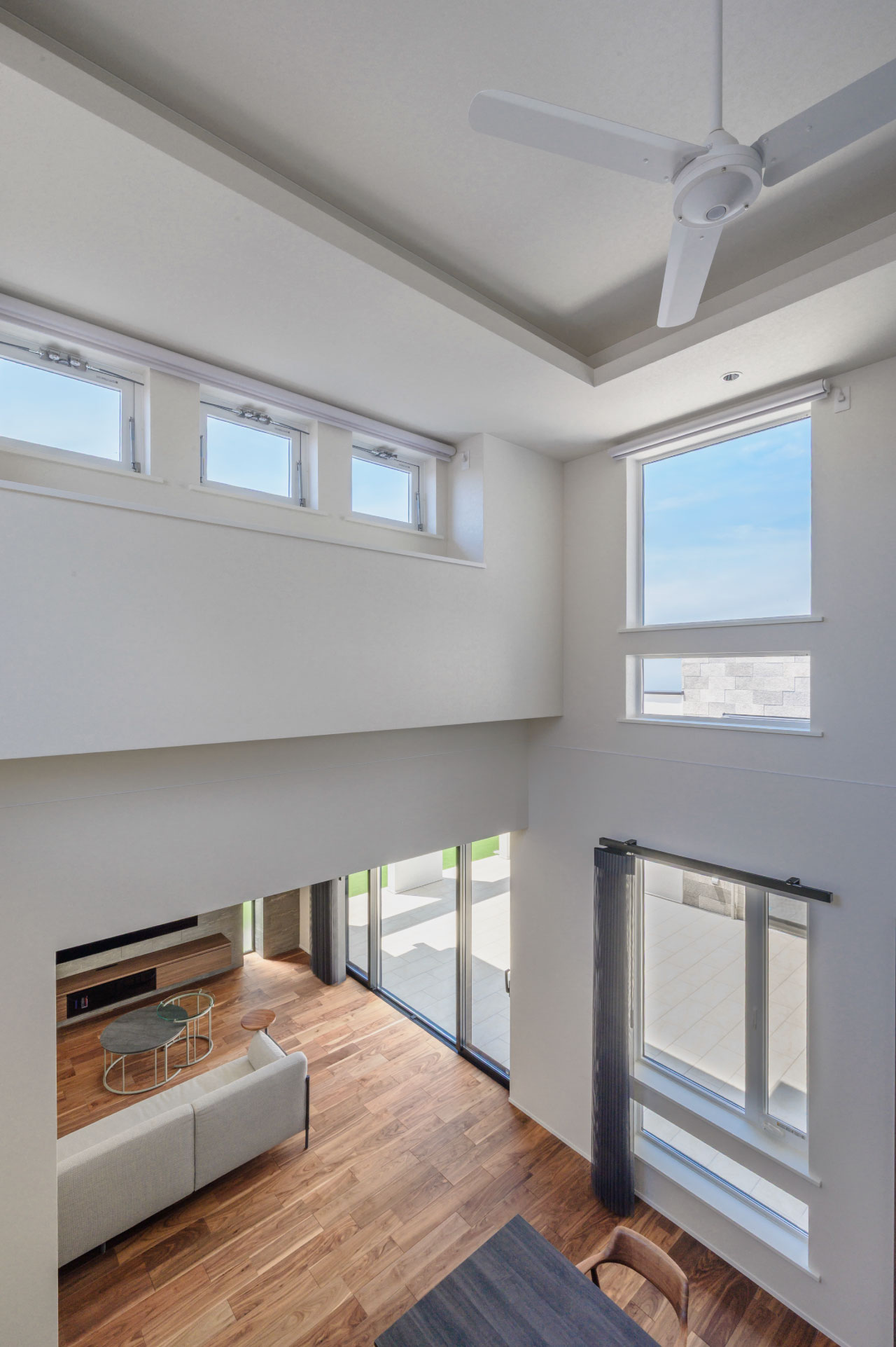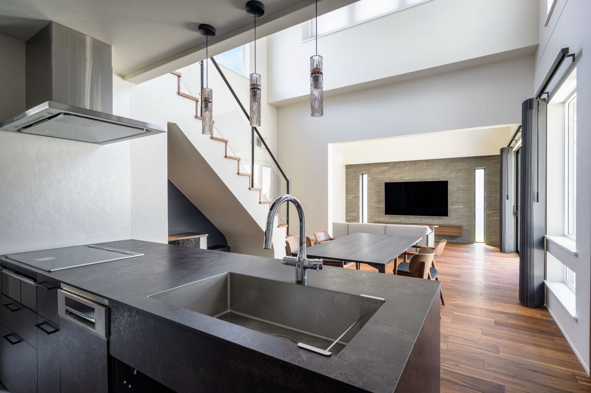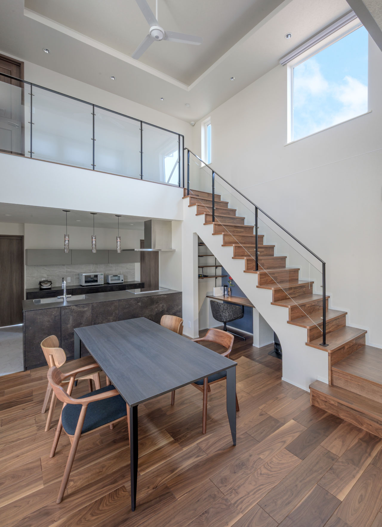 ダイニングキッチンは、階段スペースを取り込んで吹き抜け空間を実現。リビングとはまた趣の異なる奥行き感を演出している。階段下にはワークスペース、上には高窓も設けた。