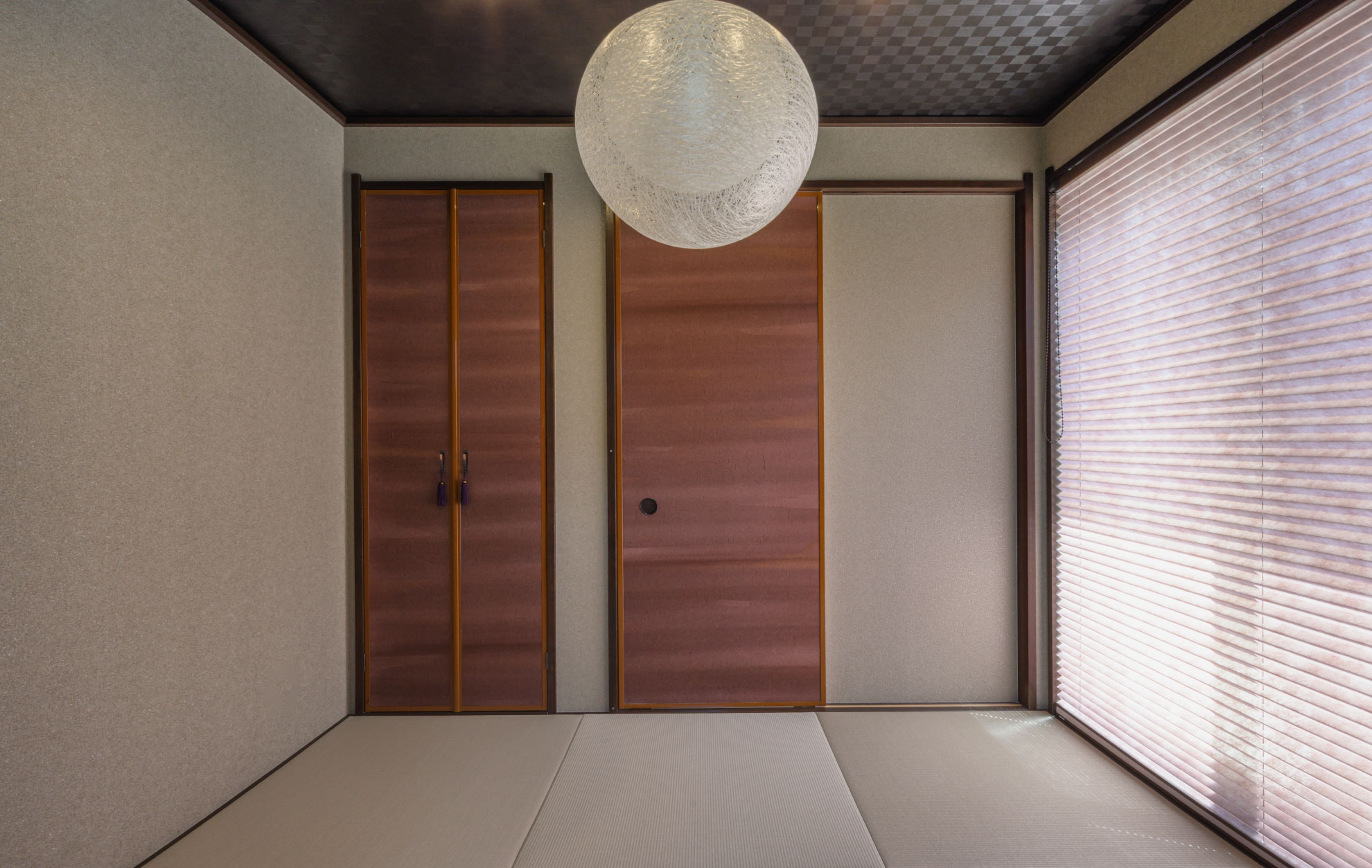 客間など多目的なスペースとして計画された4畳半の和室。縁なし畳、珪藻土クロス、天井には網代天井をイメージした柄のクロスを採用し、天然素材の質感が漂う内装に仕上げた。