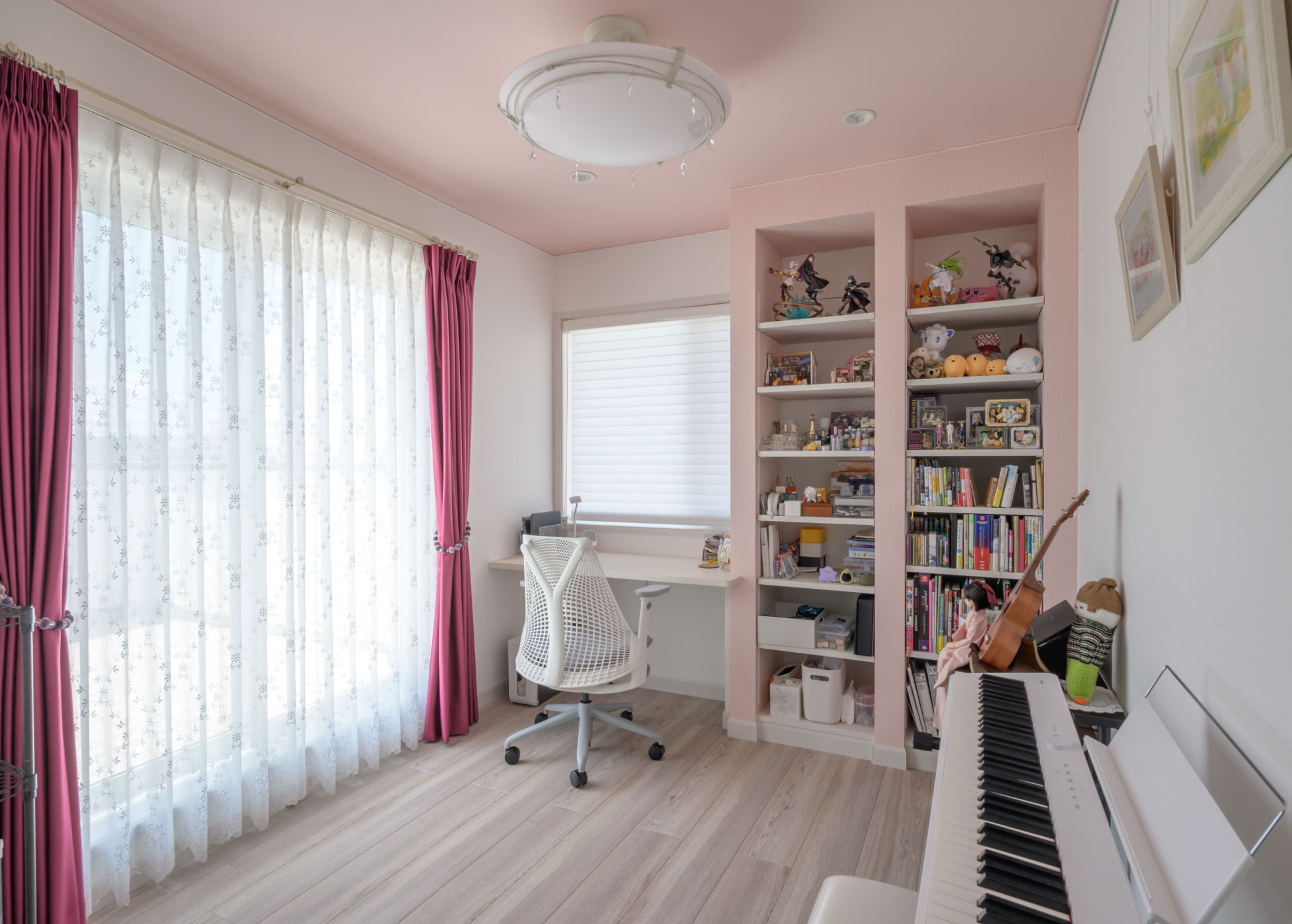 奥様の書斎は、床にペールグレーのシートフローリング。壁には塗り壁風クロスを採用。天井には織物調のピンクのクロスを合わせて、明るくキュートなインテリアに仕上げた。