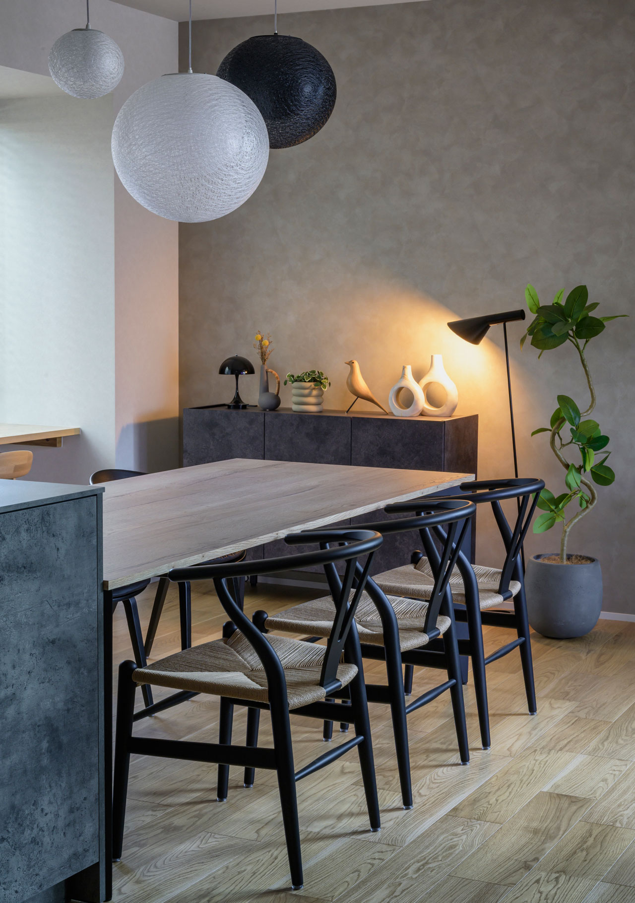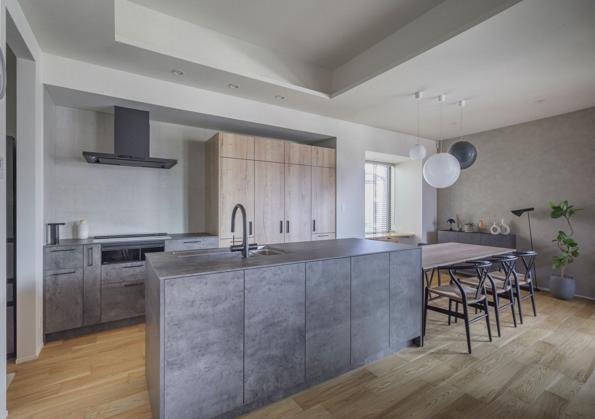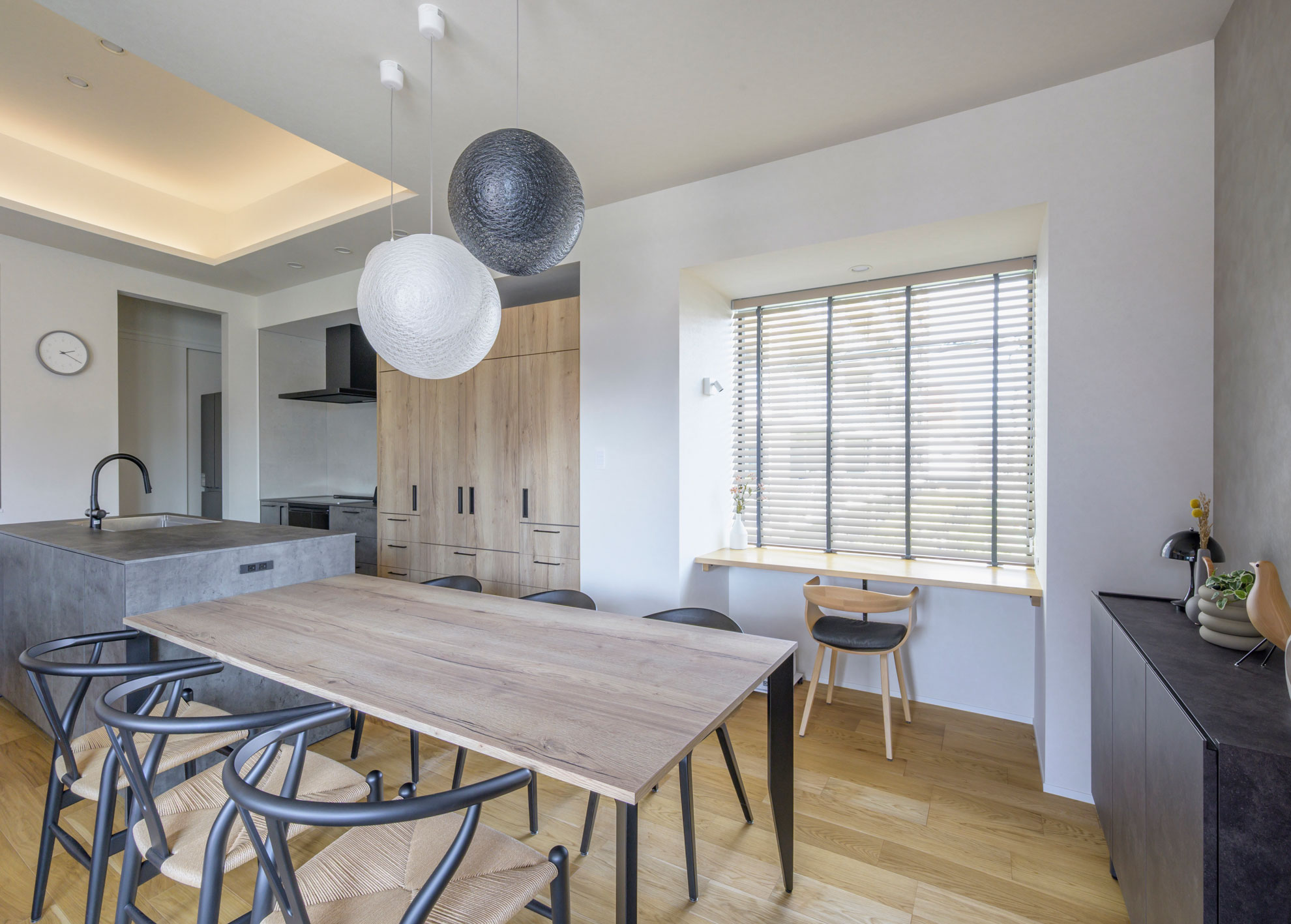 室内はトーンの異なるグレー系のカラーでスタイリッシュにまとめられた。各エリアに壁面収納を設け、ダイニングの窓辺にはデスクカウンターを設置するなどの工夫も。