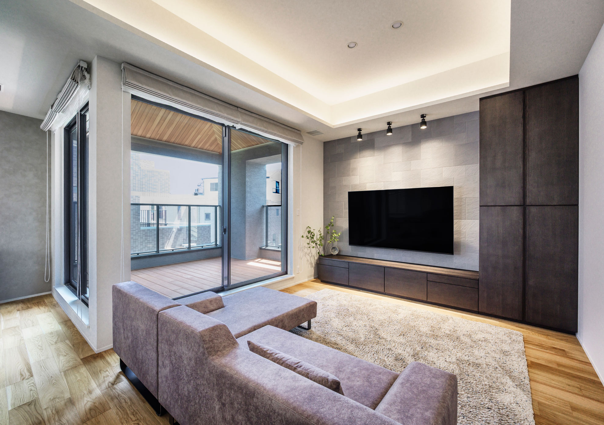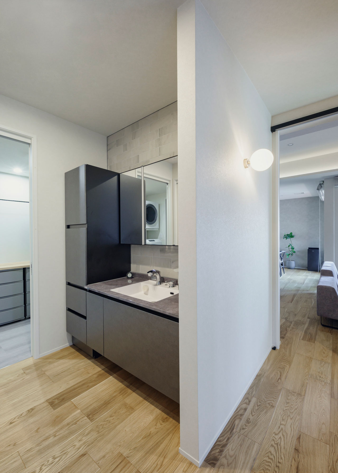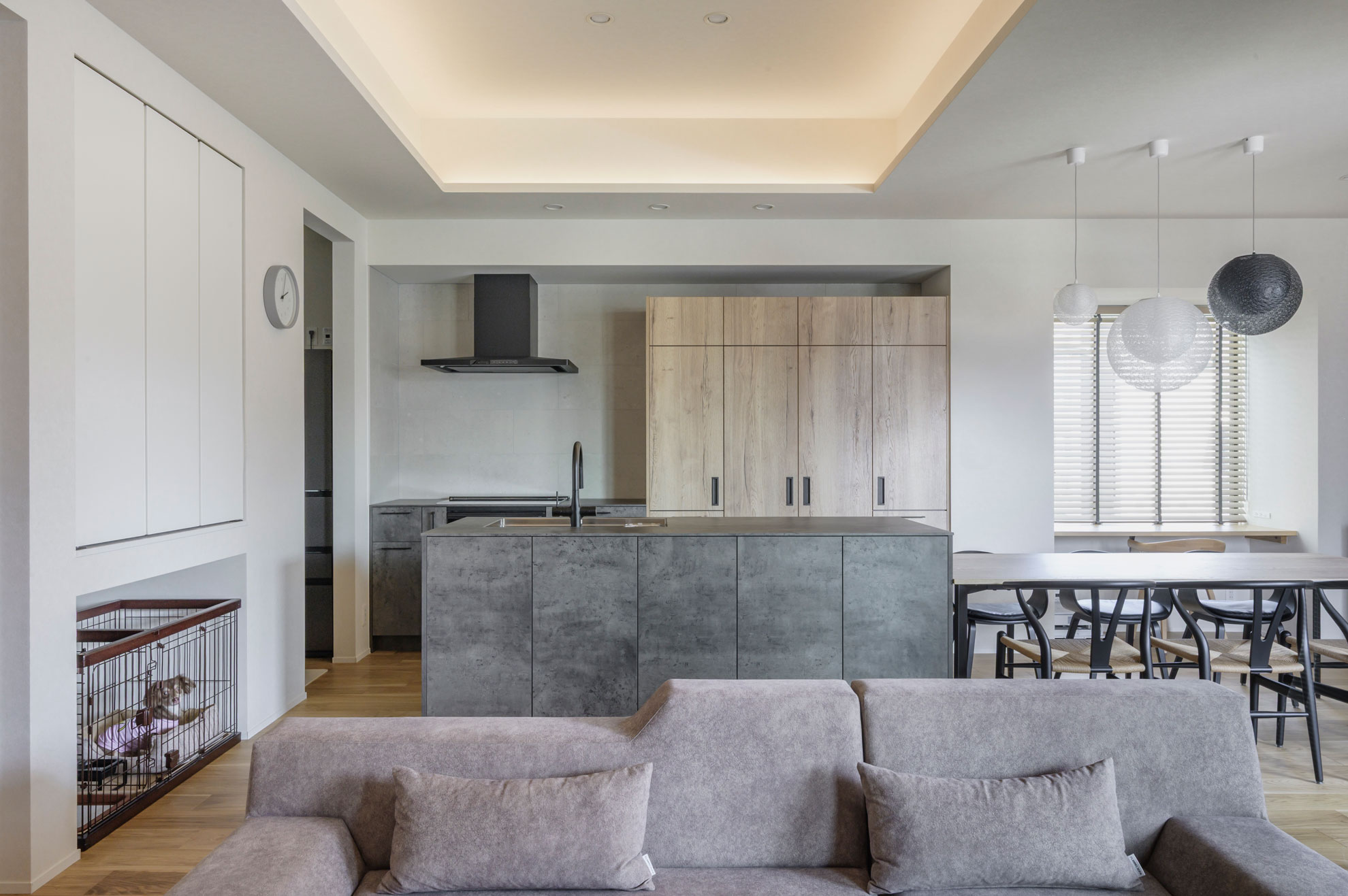 室内はトーンの異なるグレー系のカラーでスタイリッシュにまとめられた。各エリアに壁面収納を設け、ダイニングの窓辺にはデスクカウンターを設置するなどの工夫も。