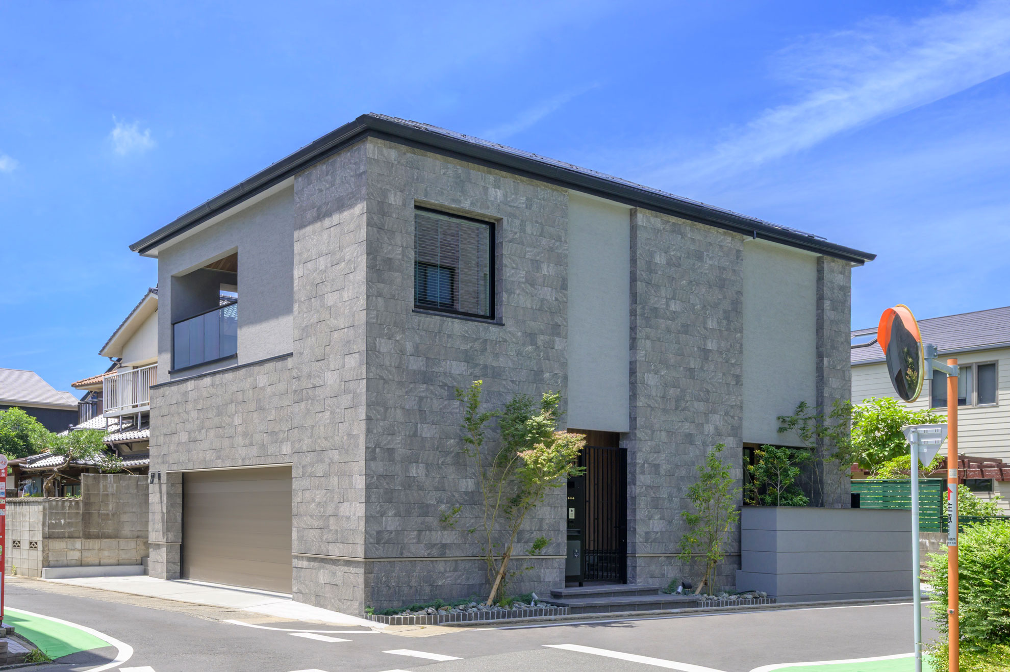 住宅街の角地に立つ建物はタイル壁をあしらって風格ある佇まいに。LDKは2階に配して、プライバシーを保ちつつ、スカイラナイを設けて広がりを演出。都市部の限られた敷地環境でものびやかに暮らせる、スタイリッシュな空間を作り上げた。