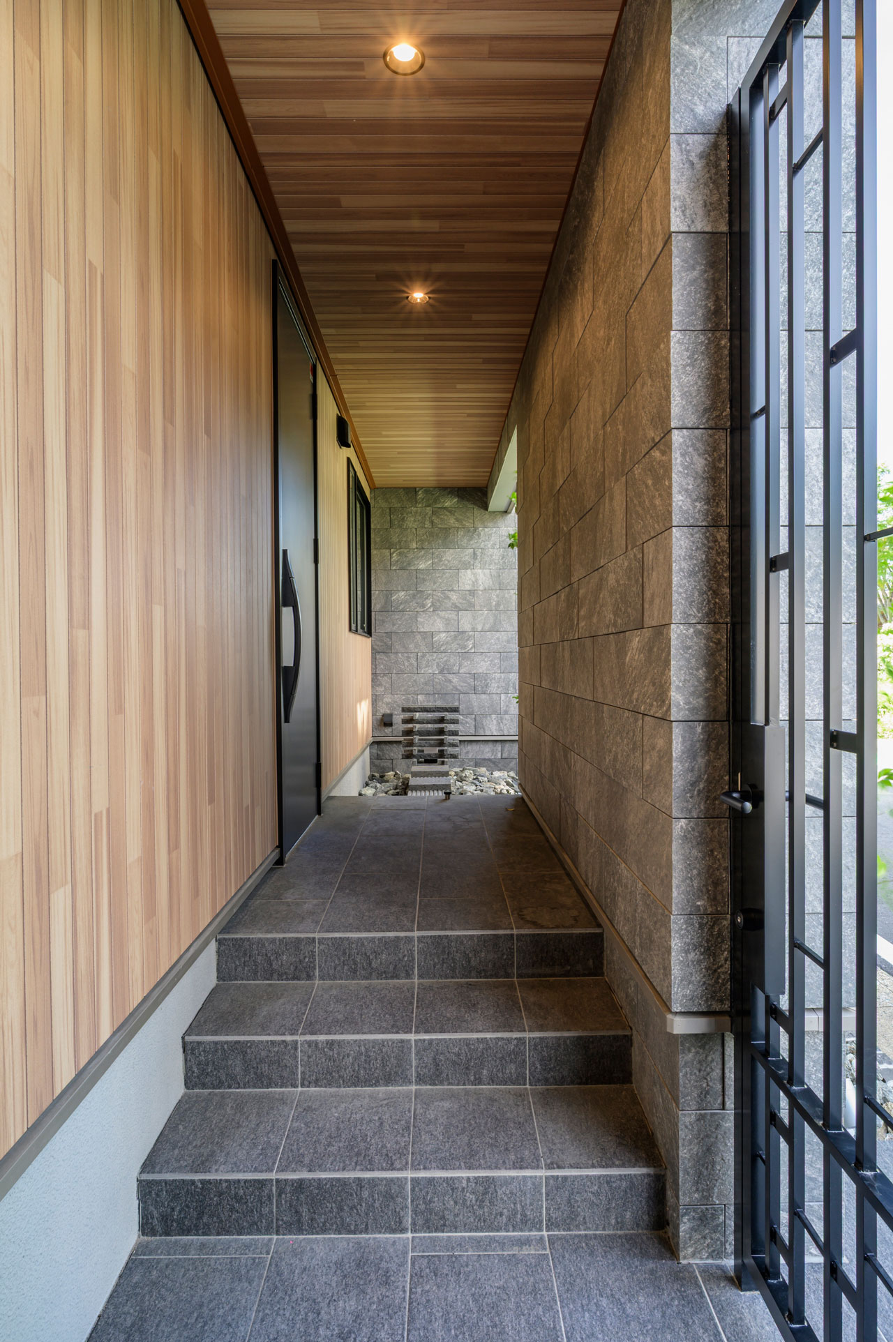 門扉を開けるとタイル貼りの外壁の内側にアプローチが現れる。レッドシダーの素材感を再現した防火サイディングと石調タイルで囲まれた趣のある路地のような空間だ。