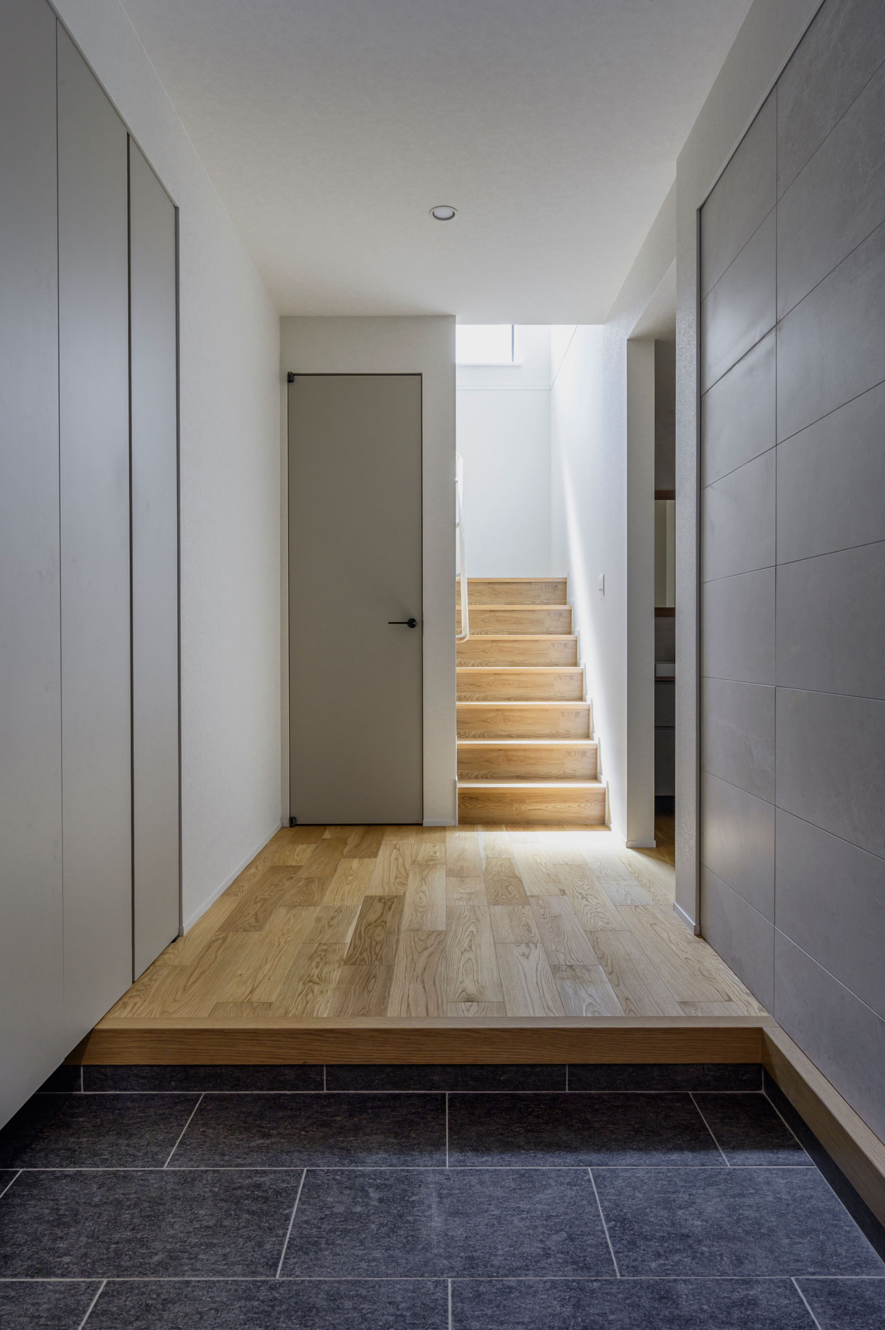 玄関土間に立つと静謐な空間が広がる。土間の右手はタイルを貼ってアクセントに。階段スペースの窓から自然光が差し込み、自然と2階へ誘われる。