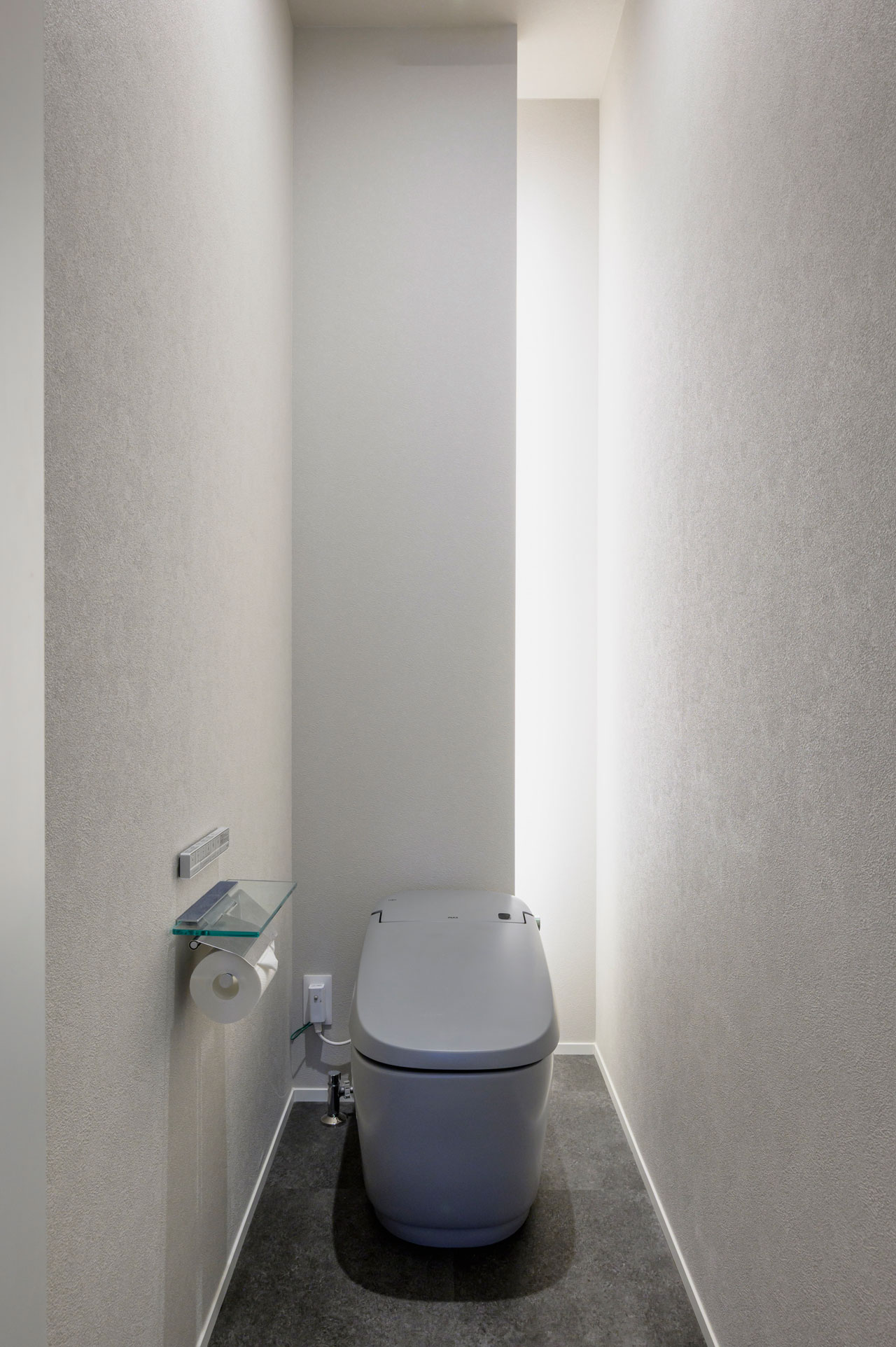 洗面台の近くにはトイレを設置。便器、フロアタイルもグレーで統一し、居室のインテリアと色調をそろえた。背後に袖壁を設けて間接照明で光をやさしく広げている。