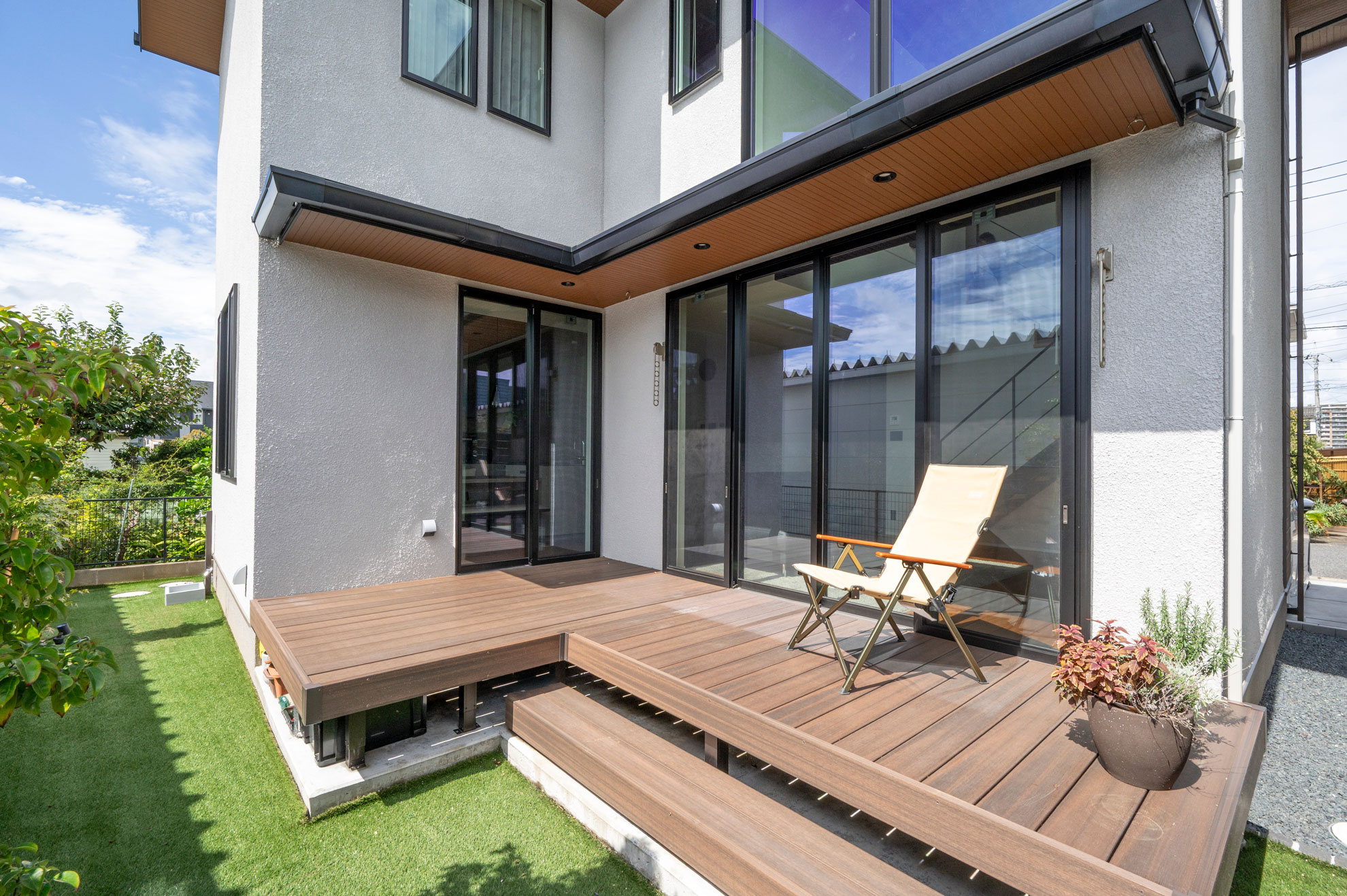 建物の南側にはLDKに沿ってL字型に中庭を設けてウッドデッキを設置。庇も付けて、プライバシーを守りながら屋外の心地よさを満喫できる場とした。