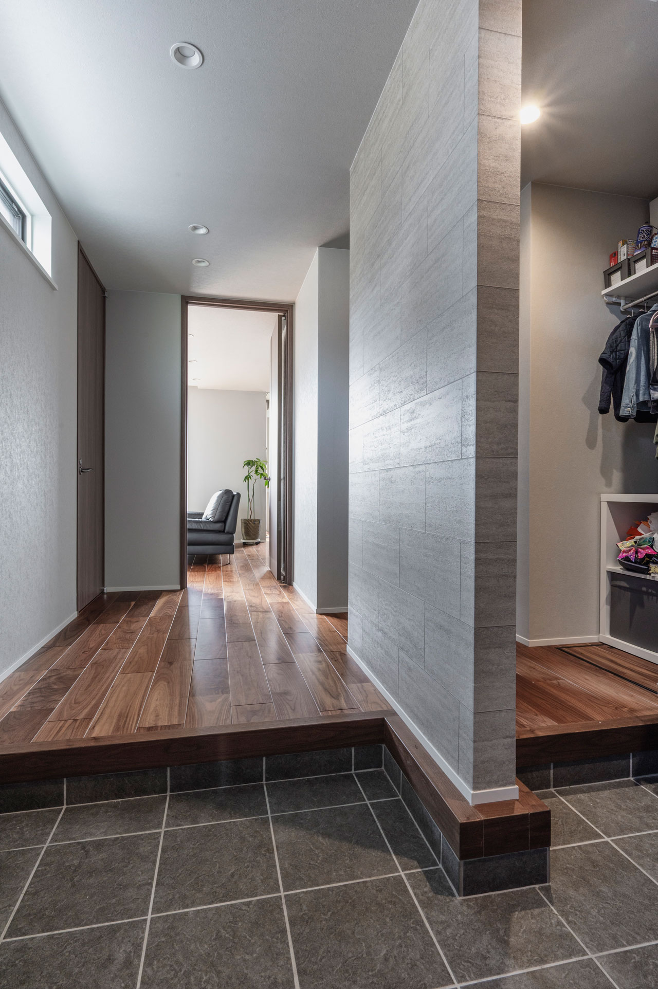 土間を、隣接するシューズクロークまで広げ、仕切り壁にはレンガ調のクロスを貼ってアクセントに。リビングと同じ内装を用いることで色調を揃え、室内の調和を図っている。
