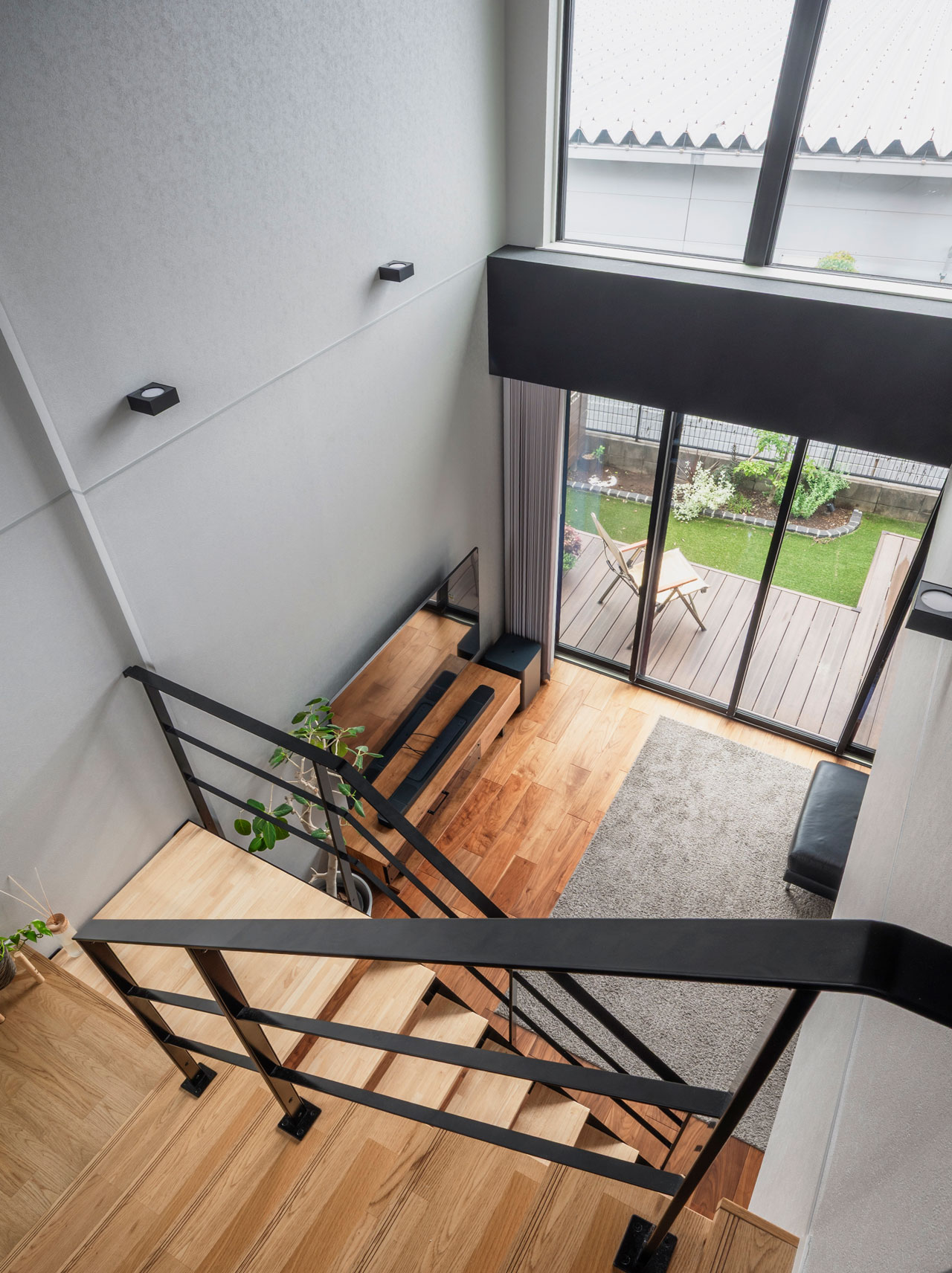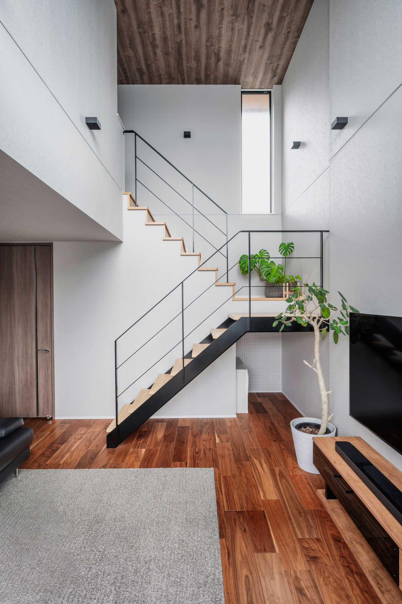 リビングは吹き抜けにし、天井には木調クロスをコーディネート。階段を取り込んで、踊り場はグリーンを飾れるようにゆったりと。リビングのフォーカルポイントにもなっている。