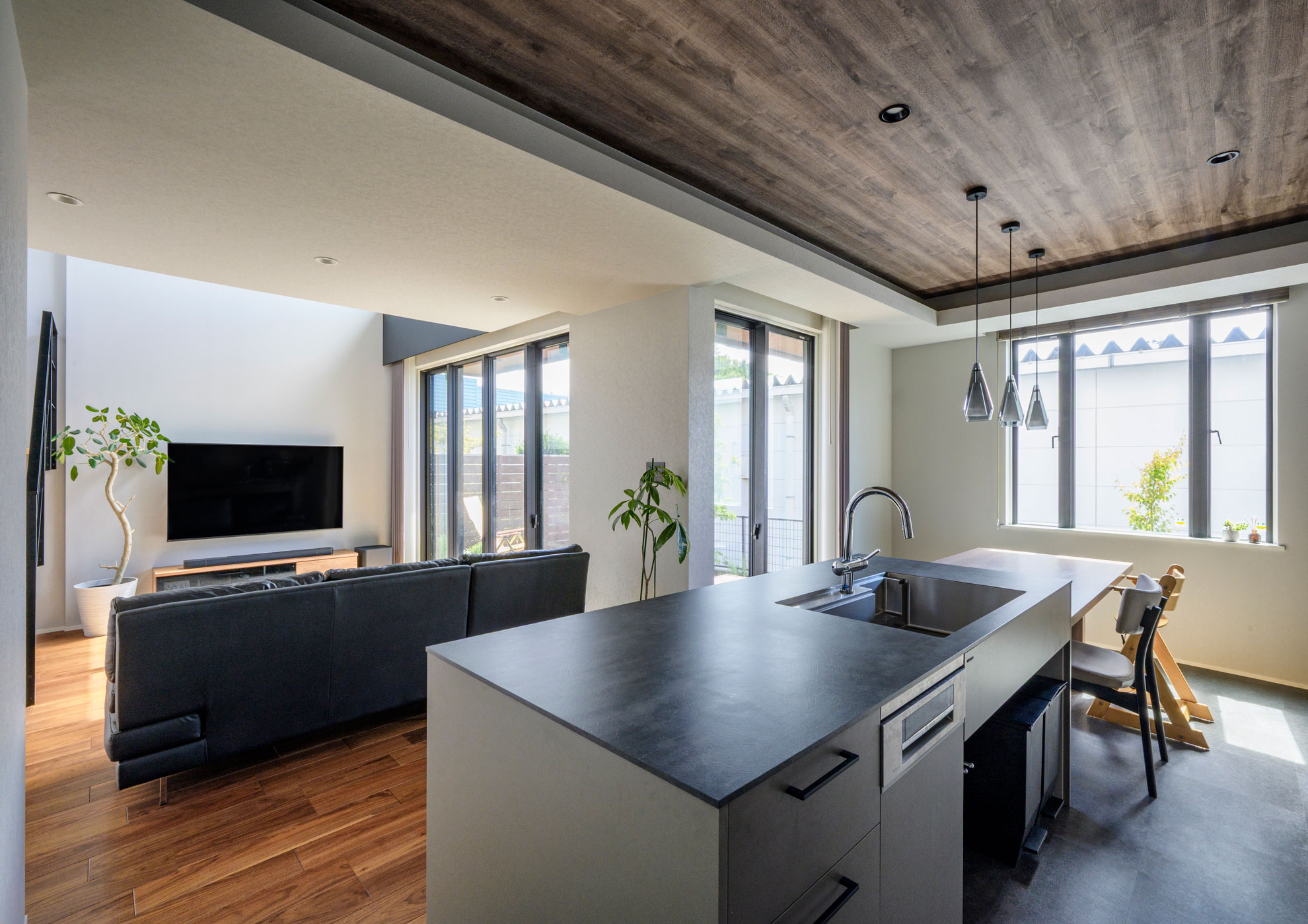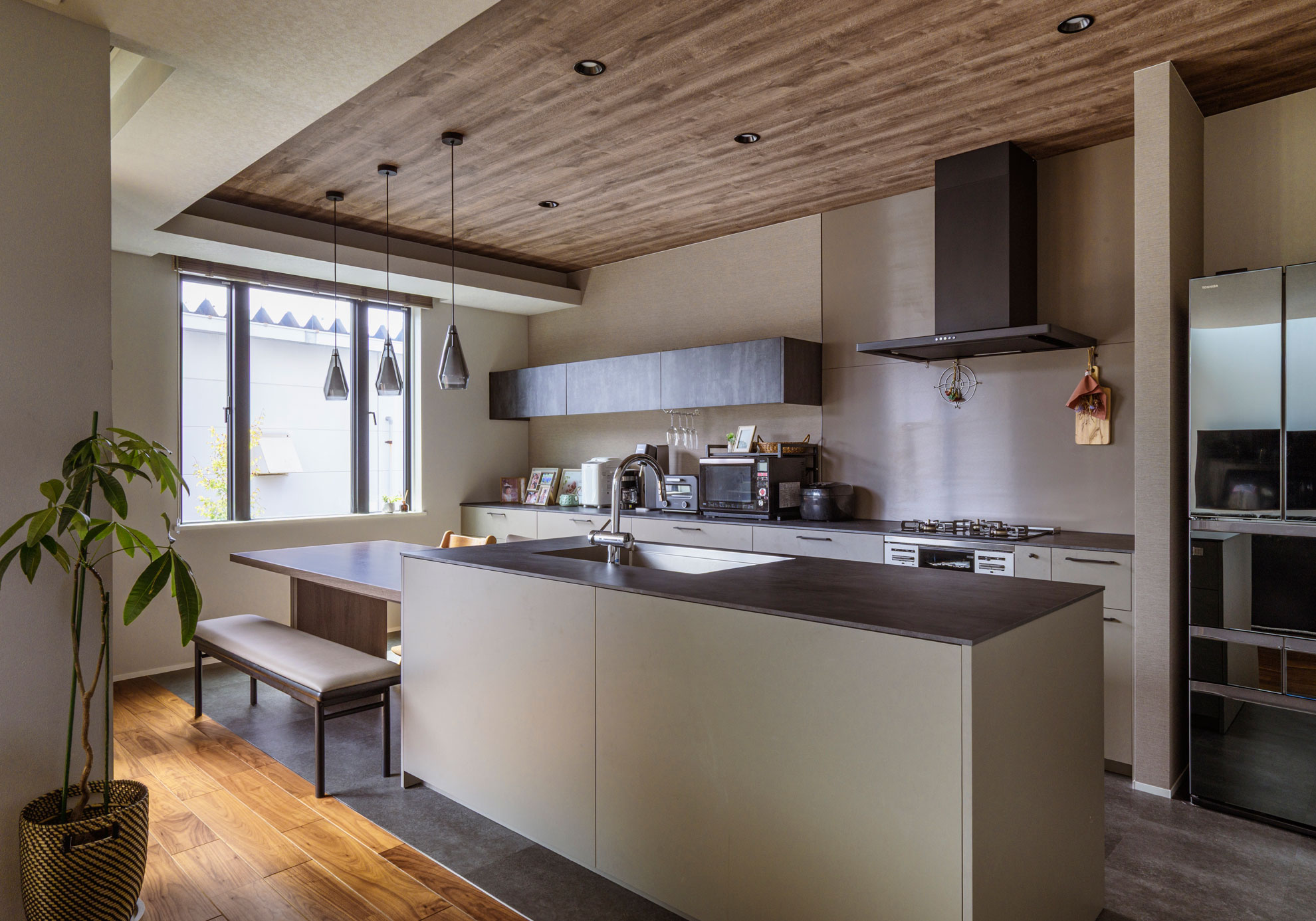 庭やリビングを見渡せる位置に配されたダイニングキッチンは、リビングとはさりげなくエリア分けをし、温もりを演出。住まいの中心として家族が集う、心地よい場所となっている。