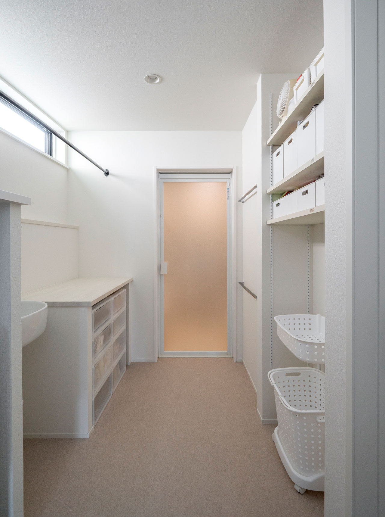 キッチンの冷蔵庫の脇のパントリーを通って、脱衣室兼ランドリー、洗面室、浴室へと続く動線を確保。水回りの家事を効率よくこなせるようになっている。