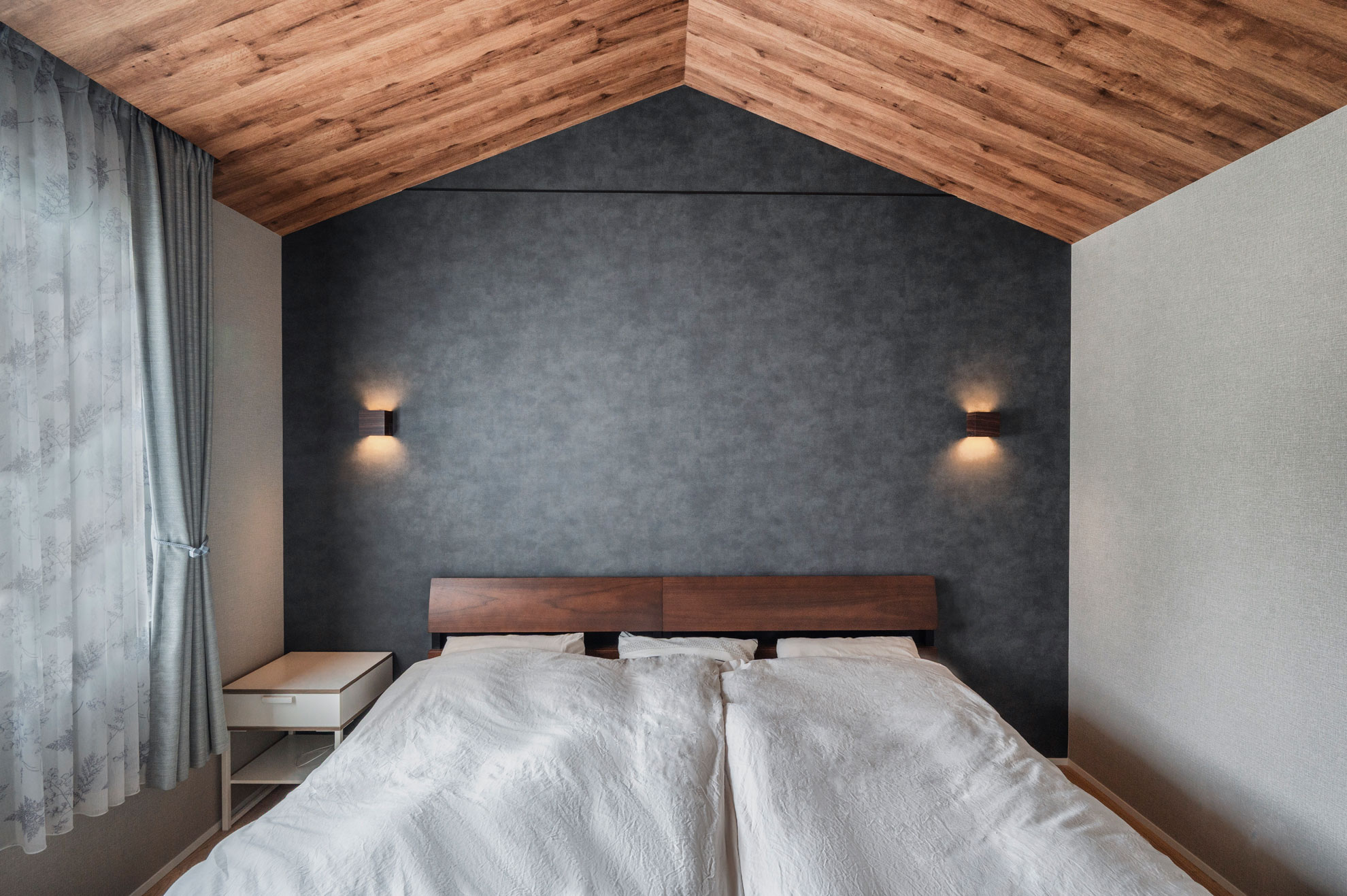主寝室は屋根形状を活かして高さを確保。天井には木調クロス、床にはチェスナットのシートフローリング、アクセントクロスは漆喰の風合いのあるクロスで大人のインテリアに。