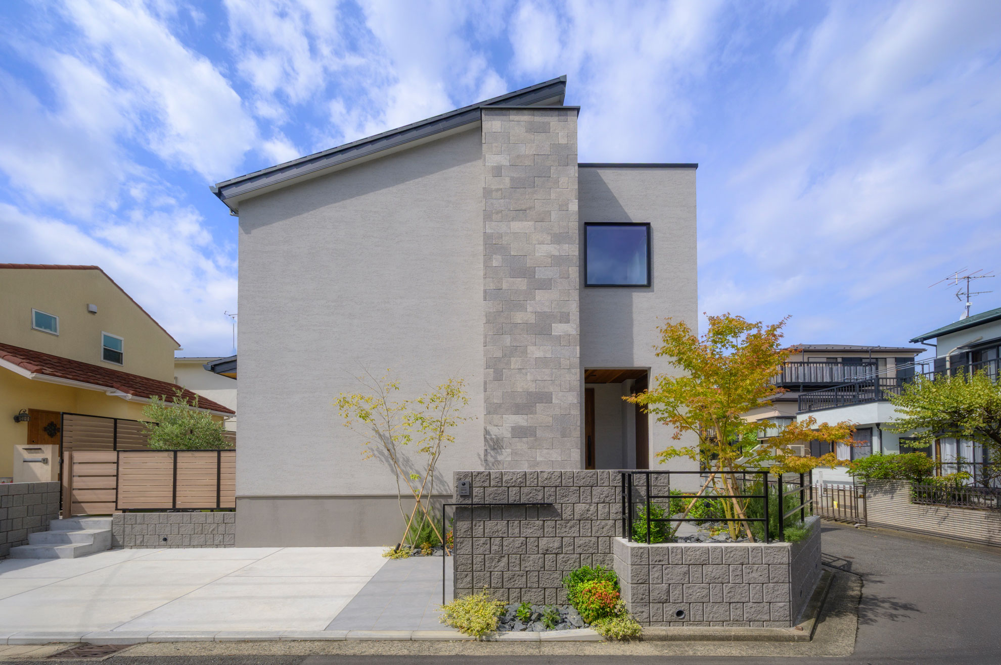 片流れの屋根とセンターにしつらえた石調タイルの外壁が個性的なファサード。室内は、グレーと木調色と黒で品よくモダンにコーディネートしアーチ開口やコテ仕上げの左官壁などの欧風テイストがほどよいアクセントに。