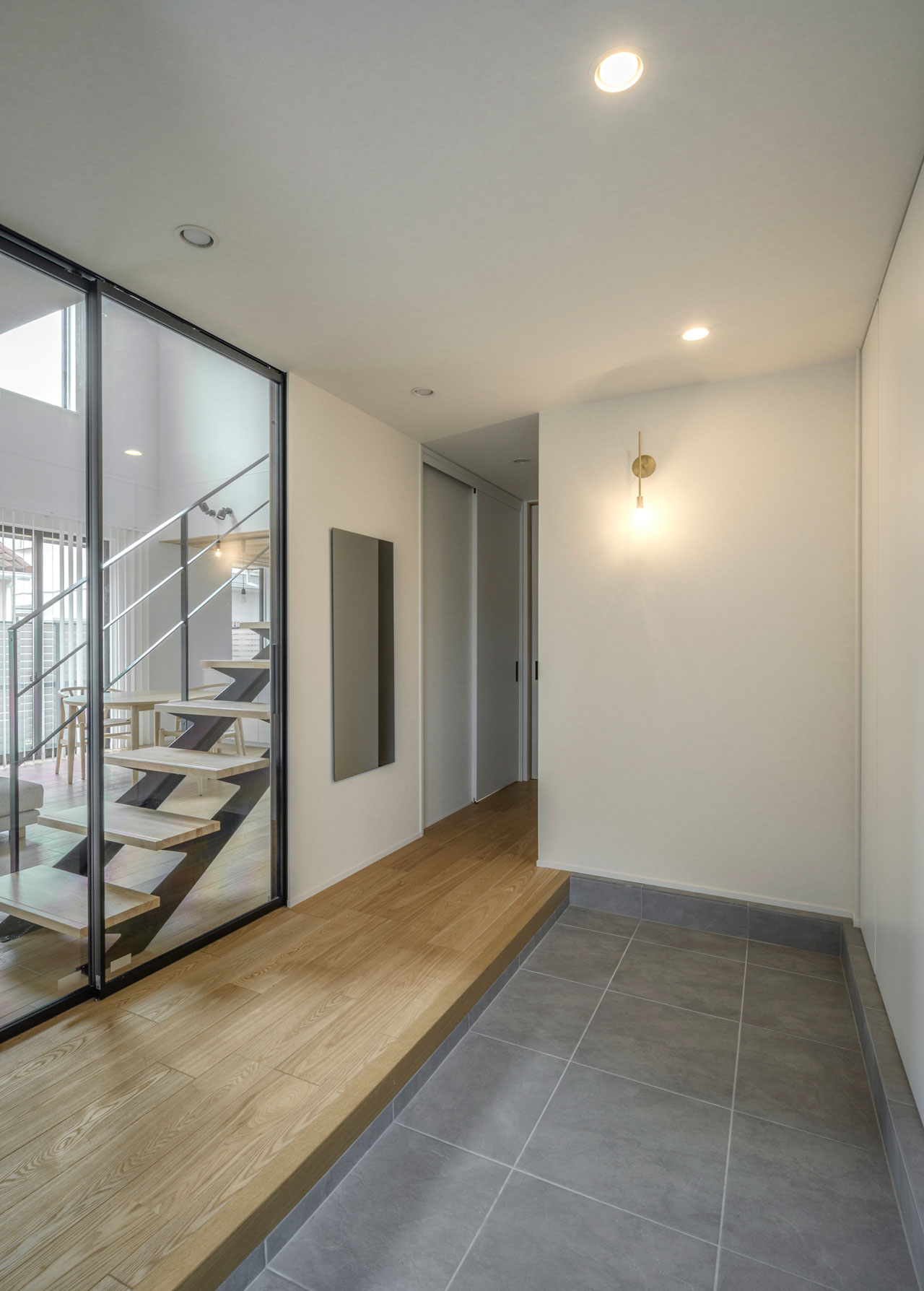 玄関の間口は約270cm、奥行きも広く確保して多人数の来客があってもゆとりをもって迎えられるようにした。ホールとリビングとの間はガラスの引き戸で広がりを演出。