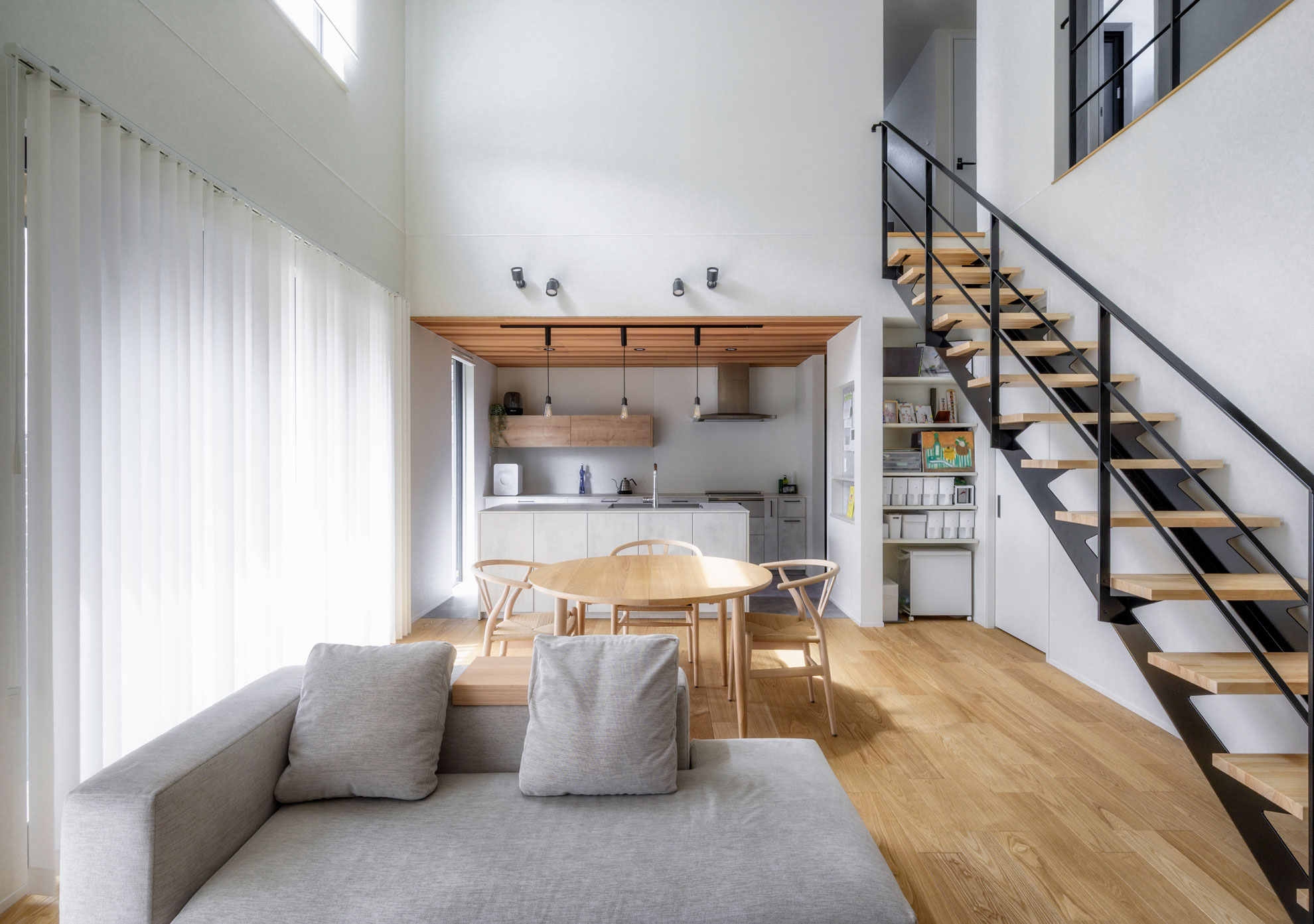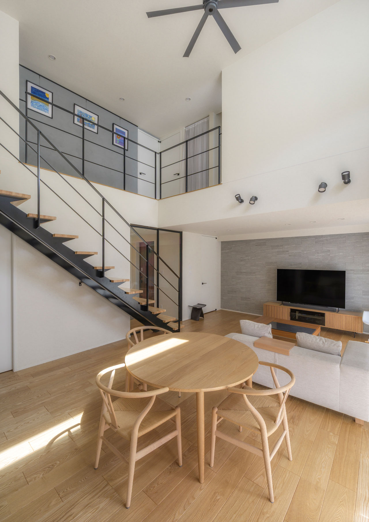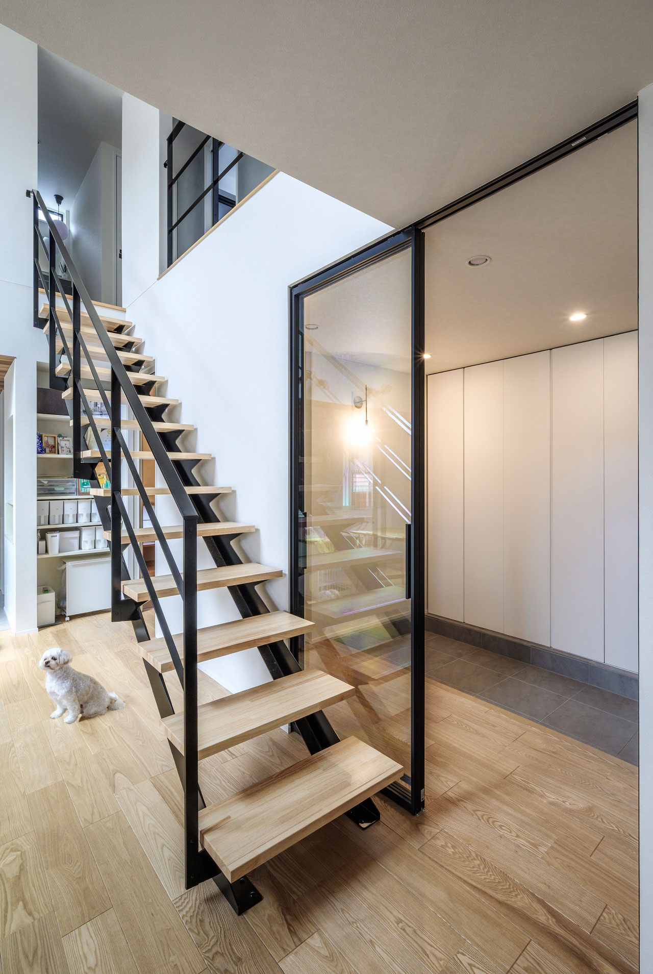 空中散歩のように吹き抜けの中を通って上り降りするスケルトン階段。階段に合わせて引き戸の色もブラックを選択。開放的な空間をほどよく引き締めている。
