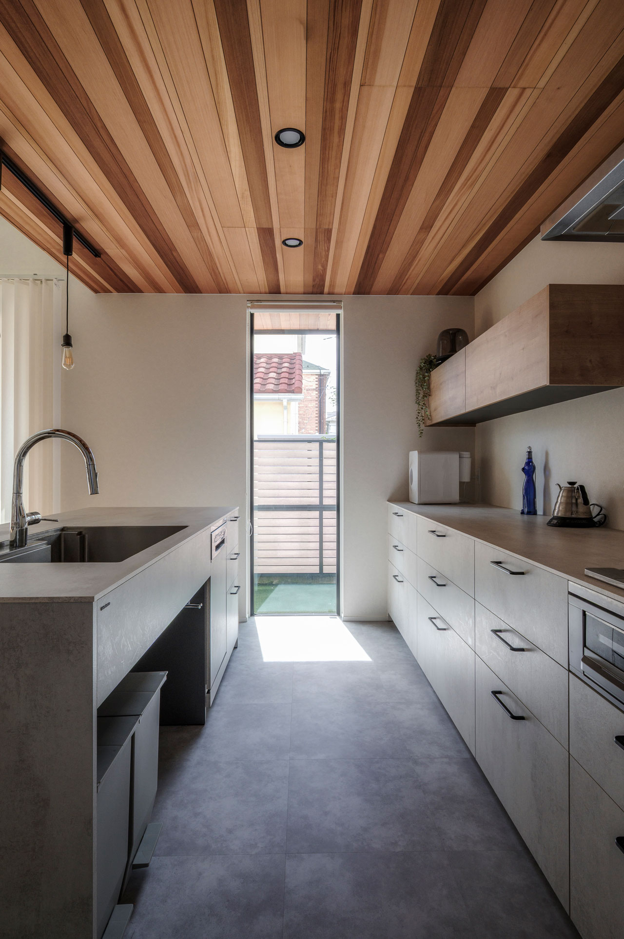 キッチンはシンクとコンロを分けたデュエスタイルを採用。足元はグレーのフロアタイルで仕上げた。天井にはピーリング材を貼り、ピクチャーウインドウで明るさも確保。