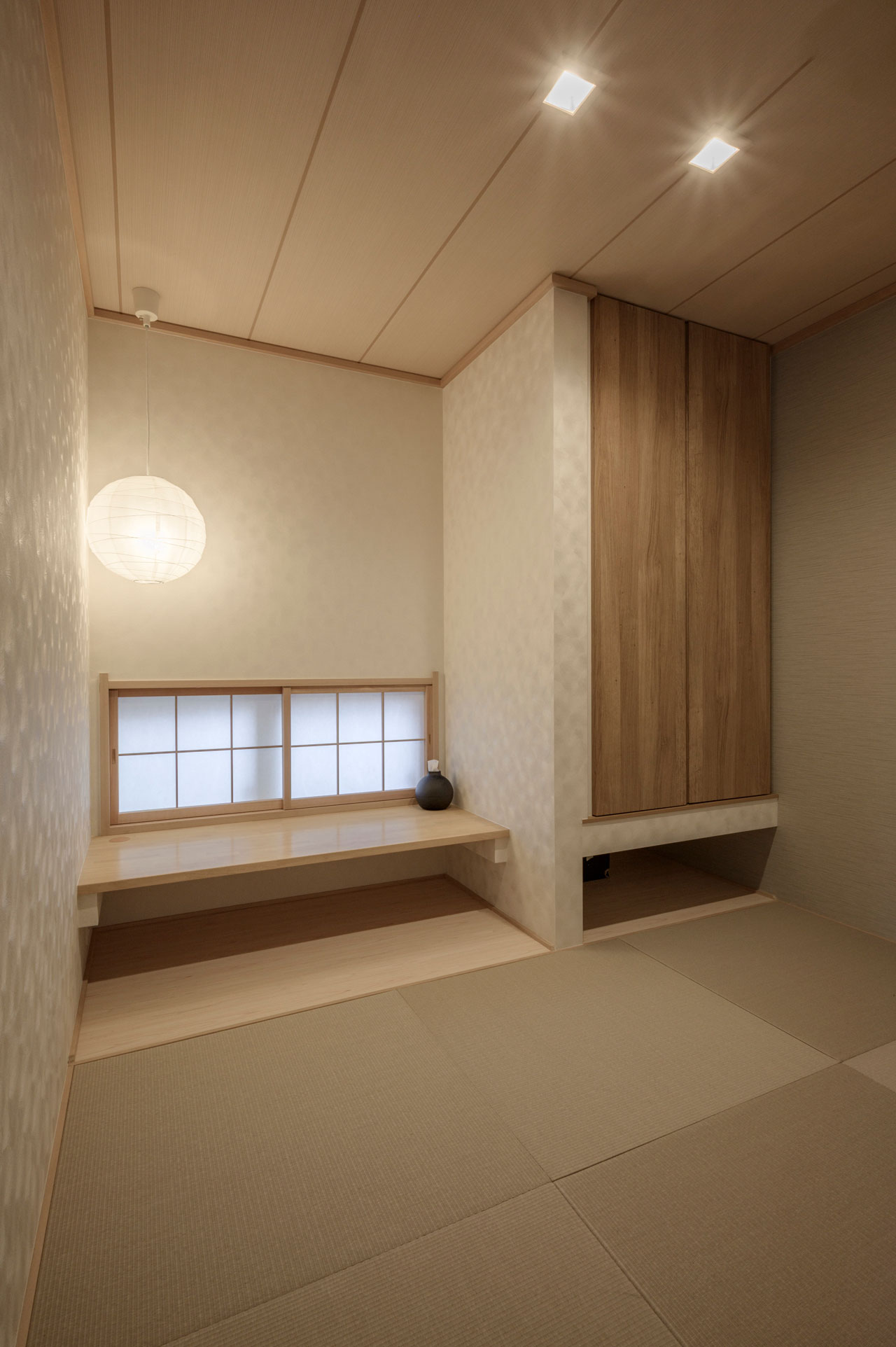 1階には玄関ホールの先に和室も設けた。小窓の下には書机風のカウンターを設け、縁無し畳でモダンな仕上がりに。趣味やワークスペース、また、来客用としても使われている。