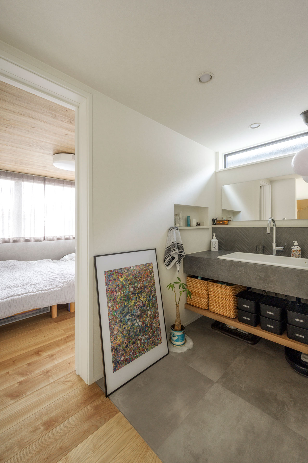 ホールの西側には洗面コーナー、その隣には主寝室を配した。洗面台はオリジナルで、グレーをベースに仕上げ、室内のインテリアとの調和を図った。