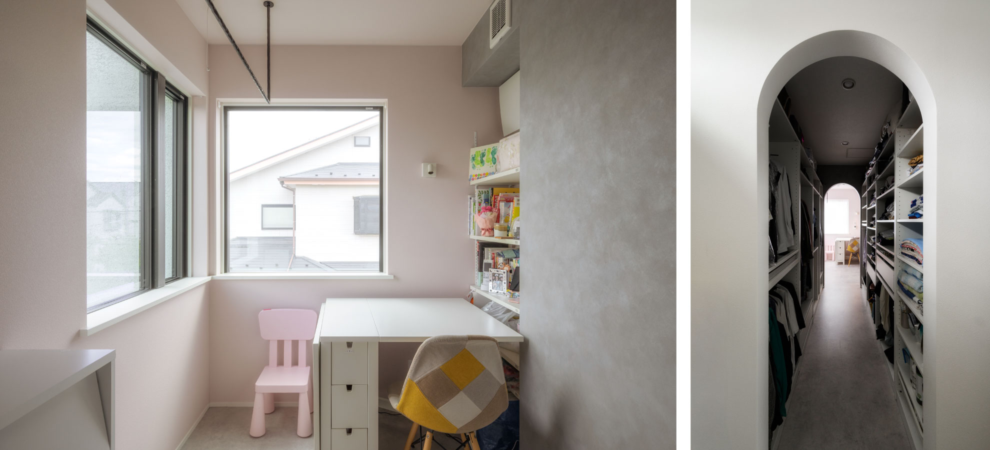 2階の北側には、浴室、脱衣室兼ランドリー、ファミリークロゼットと生活動線が一直線に並んでいる。クロゼットの出入り口は欧風のアーチ開口に。その先のユーティリティーは室内物干しのスペースであるとともに、奥様のワークスペースとしても活用。
