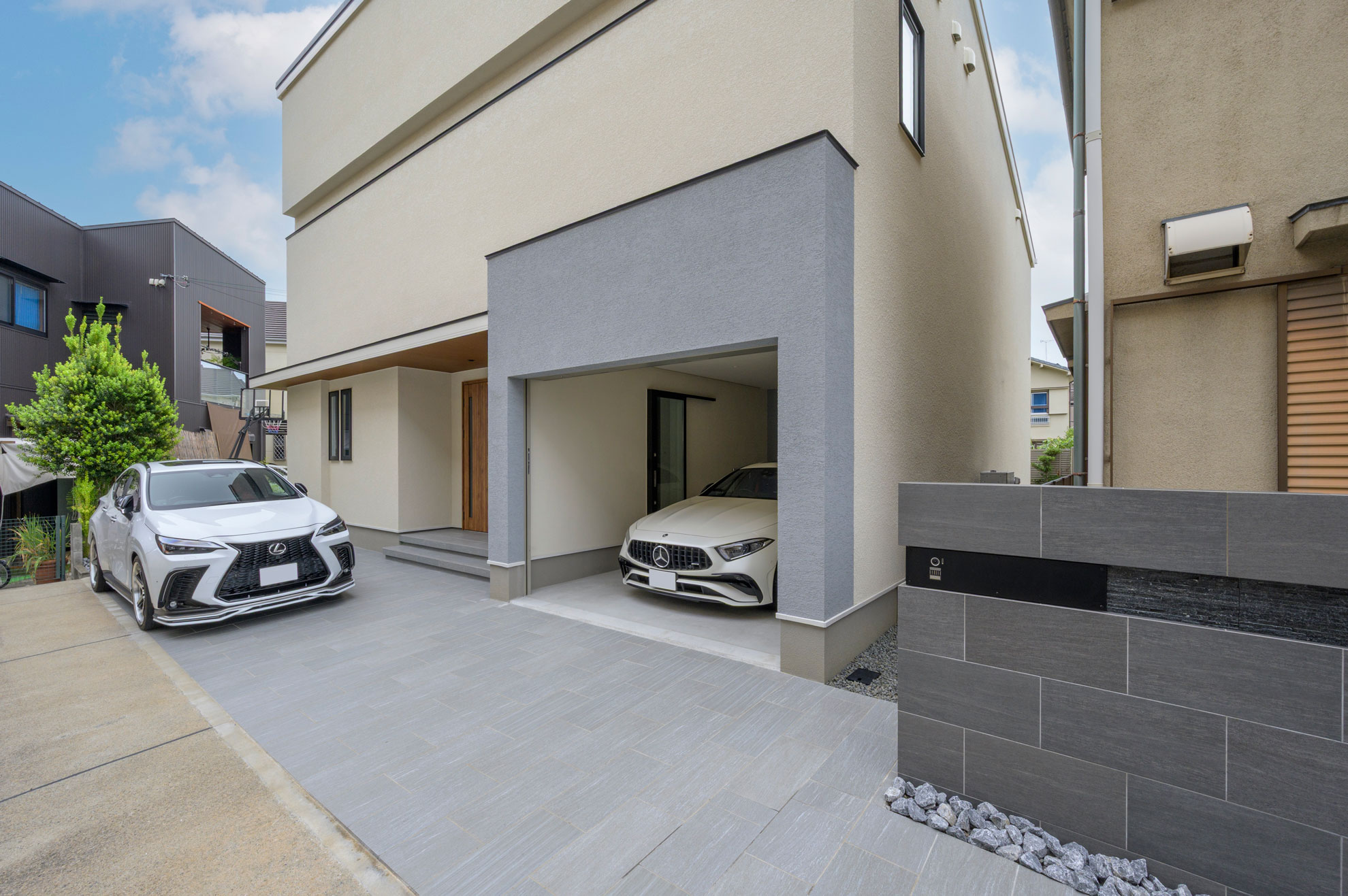グレーのタイルを敷き詰めた旗竿部分の先に現れる外観。外壁はチェリーホワイトの吹き付け仕上げにし、インナーガレージ部分をブルーグレーの吹き付けでアクセントを付けた。