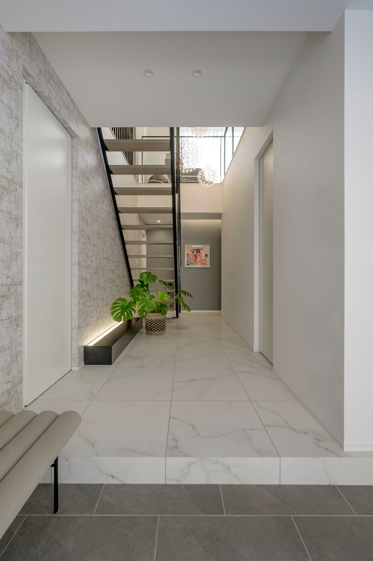 玄関に入ると、吹き抜けになった階段スペースが広がる。階段下には照明を仕込んだ「黒のステージ」を設置。ホールのフォーカルポイントとなっている。
