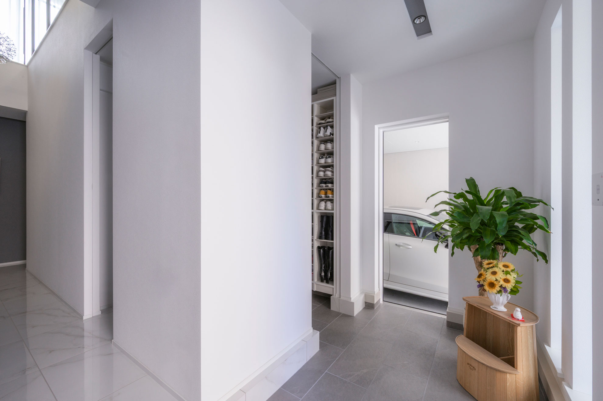 土間から続くシューズクロークはホールにもつながり、約2.3畳の広さを確保。土間の壁にはフィクス窓を設けて、インナーガレージの様子が見えるようにした。