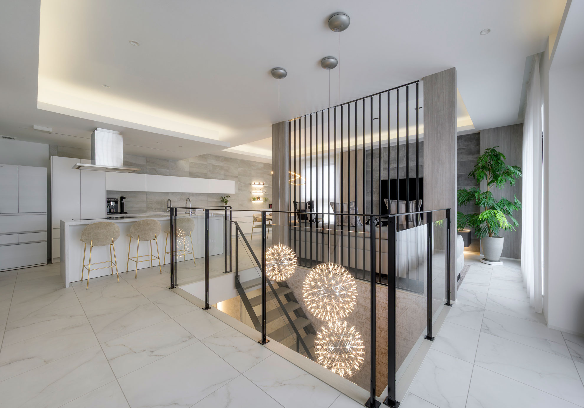旗竿状の敷地に計画されたのは、2階リビングのプラン。1階のオフィスは落ち着く雰囲気のインテリアに、2階のLDK は白を基調にした開放的な空間。家全体が、洗練されたホテルライクインテリアに包まれた住まいだ。